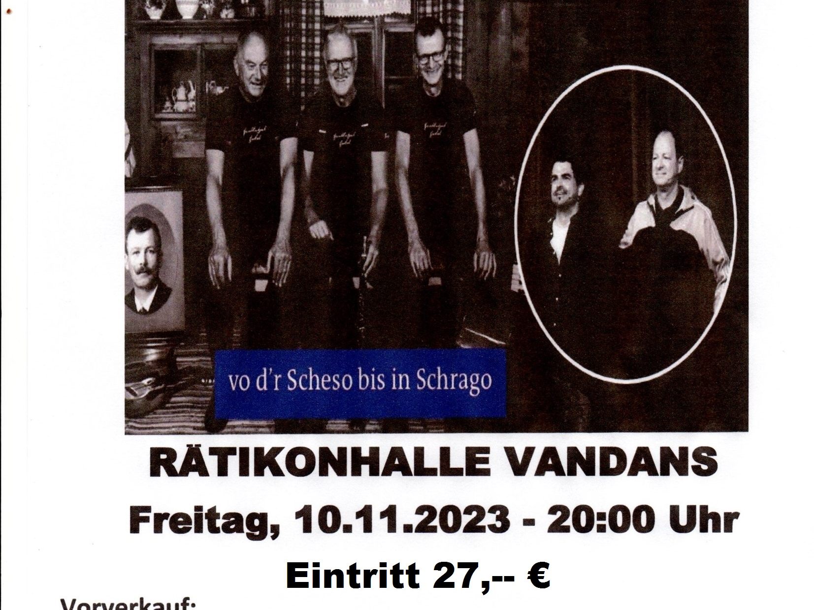 9.10.2023 Am Freitag den 10. November gastieren Hans Kaspas Enkel, das sind Ulrich Troy und seine Cousins Richard und Jos Natter um 20:00 Uhr in der Rätikonhalle Vandans, abgerundet wird das Programm "Vo dr Scheso bis in Schrago" von den beiden Vollblutkabarettisten Markus Lins und Manfred Kräutler.