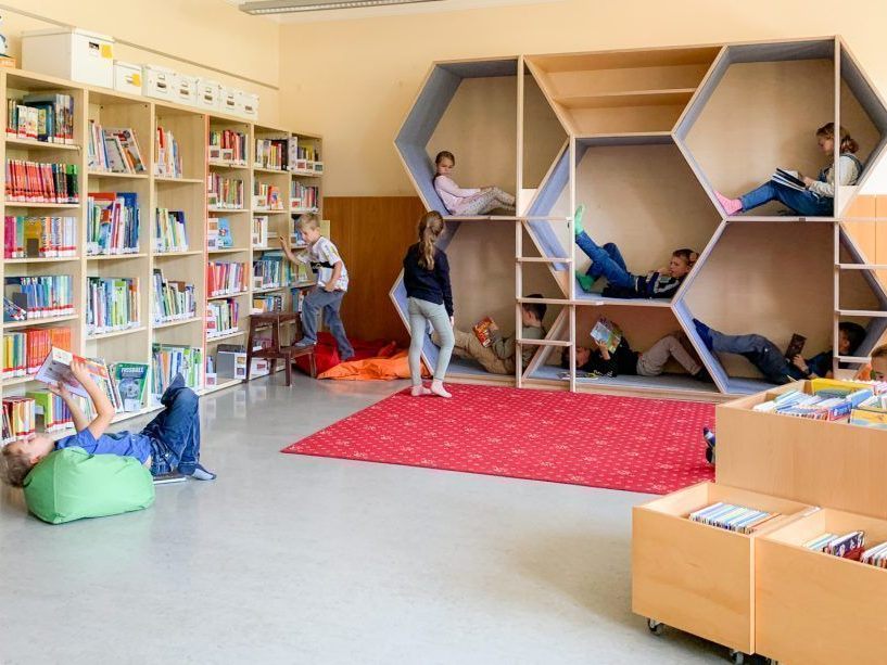 28.03.2023 Die Bücherei musste umsiedeln und wurde aus diesem Anlass auch gleich mit neuen Lesewaben ausgestattet. Die Kinder kommen hier zusammen und erleben so tolle Lesestunden.