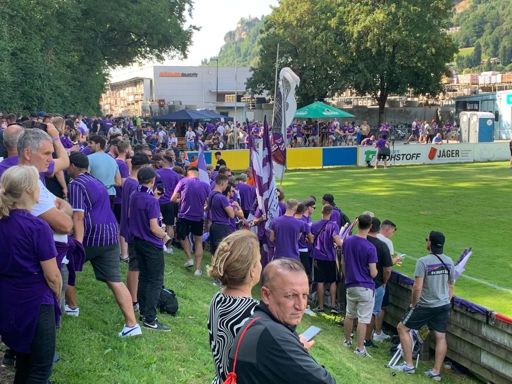 23.07.2023 Hunderte Fans von Gegner Austria Salzburg sorgen beim Cup-Spiel in Wolfurt für eine gute Stimmung. Spiel startete wegen dem Verkehrschaos in Deutschland, die Salzburger Anhänger kamen spät zum Match. Beginn statt um 16.30 um 16.50 Uhr. Die Ordner von Wolfurt leisteten beste Arbeit mit den friedlichen Salzburg-Fans.