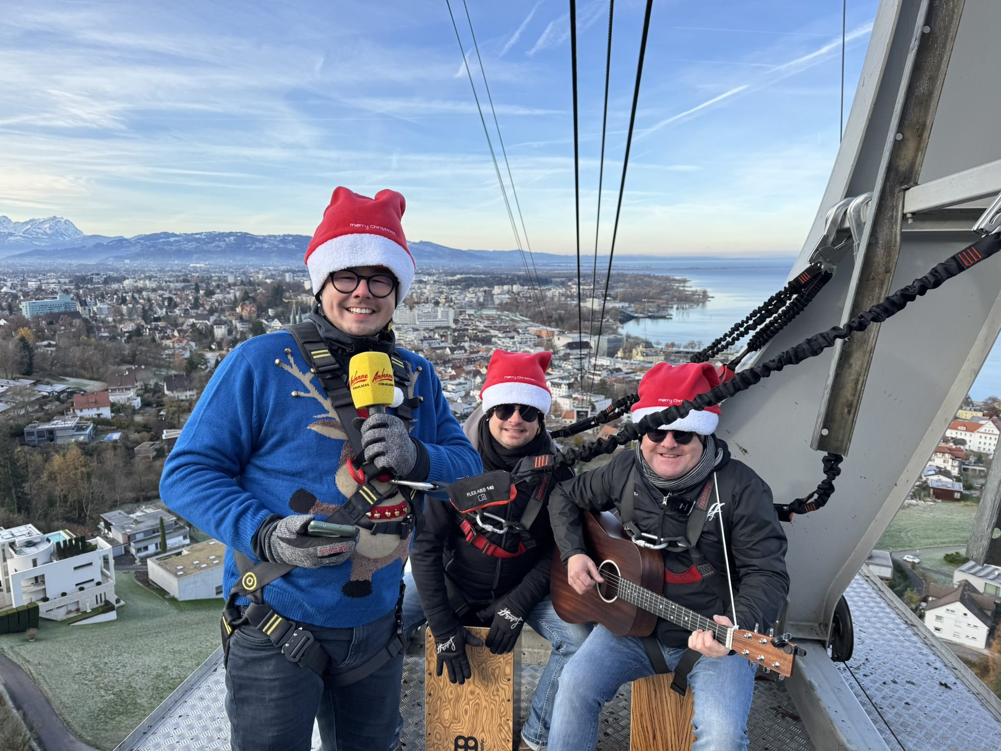 19.11.2025 Bregenz – So einen Auftritt hat es noch nie gegeben: ein "Konzert" AUF einer Gondel in 70 m Höhe. Mit "Last Christmas" in Dauerschleife läutete Simon Stark die Weihnachtszeit ein.