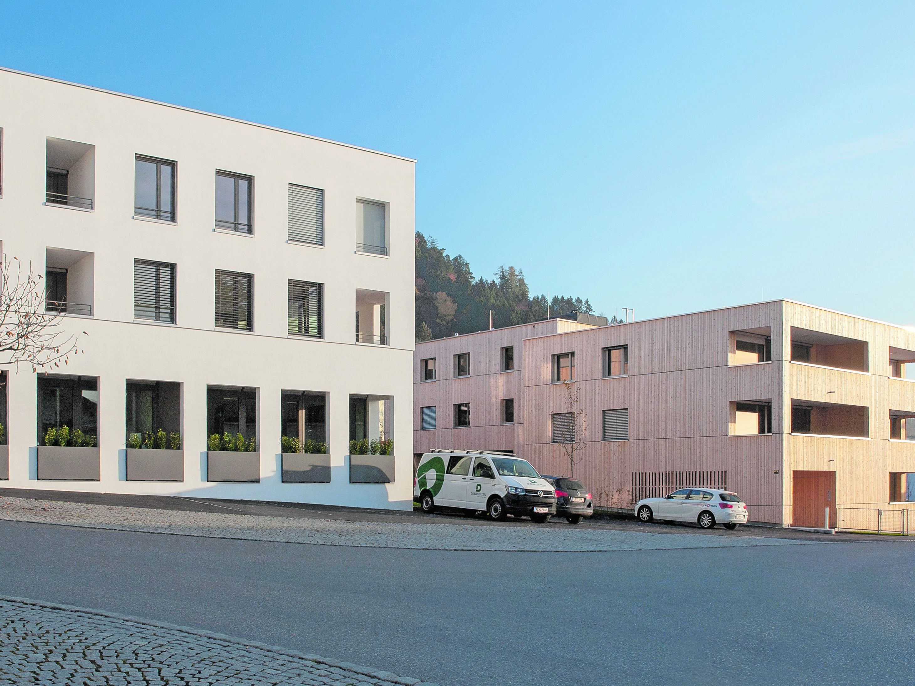 9.02.2019 In der Baukultur-Gemeinde Zwischenwasser reagiert eine Wohnanlage mit versetzten Ebenen in Doppelhäusern auf den Hang.
