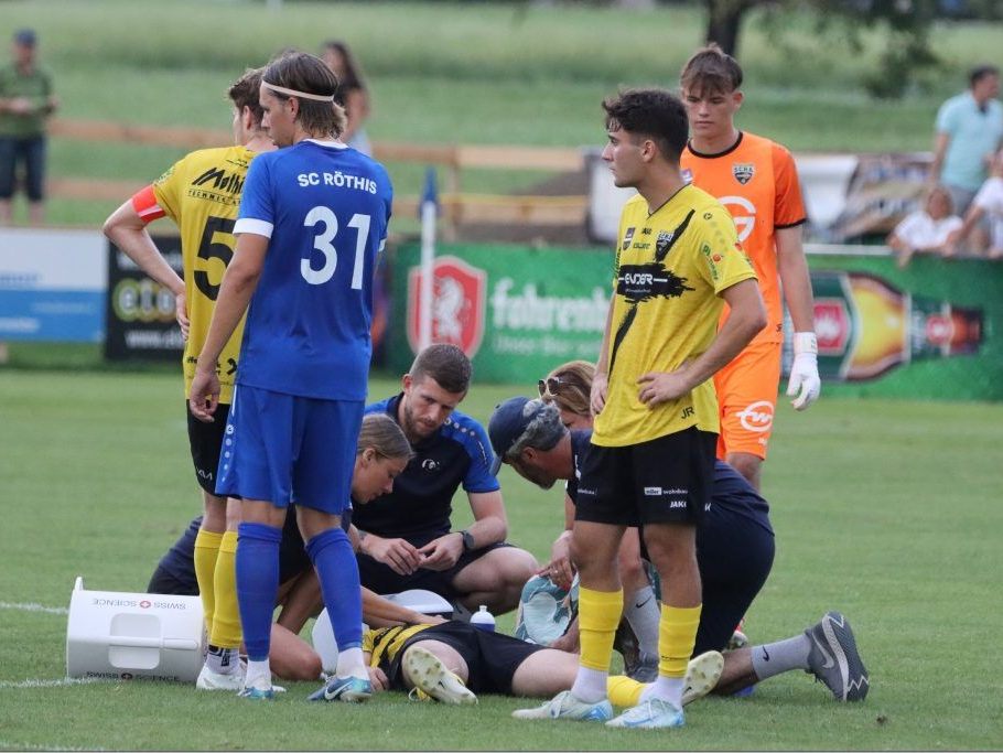 17.08.2024 Altachs Juniors-Kicker Ardian Ademi musste im Derby gegen Röthis (3:1) noch am Platz vom Krankenwagen geholt werden.