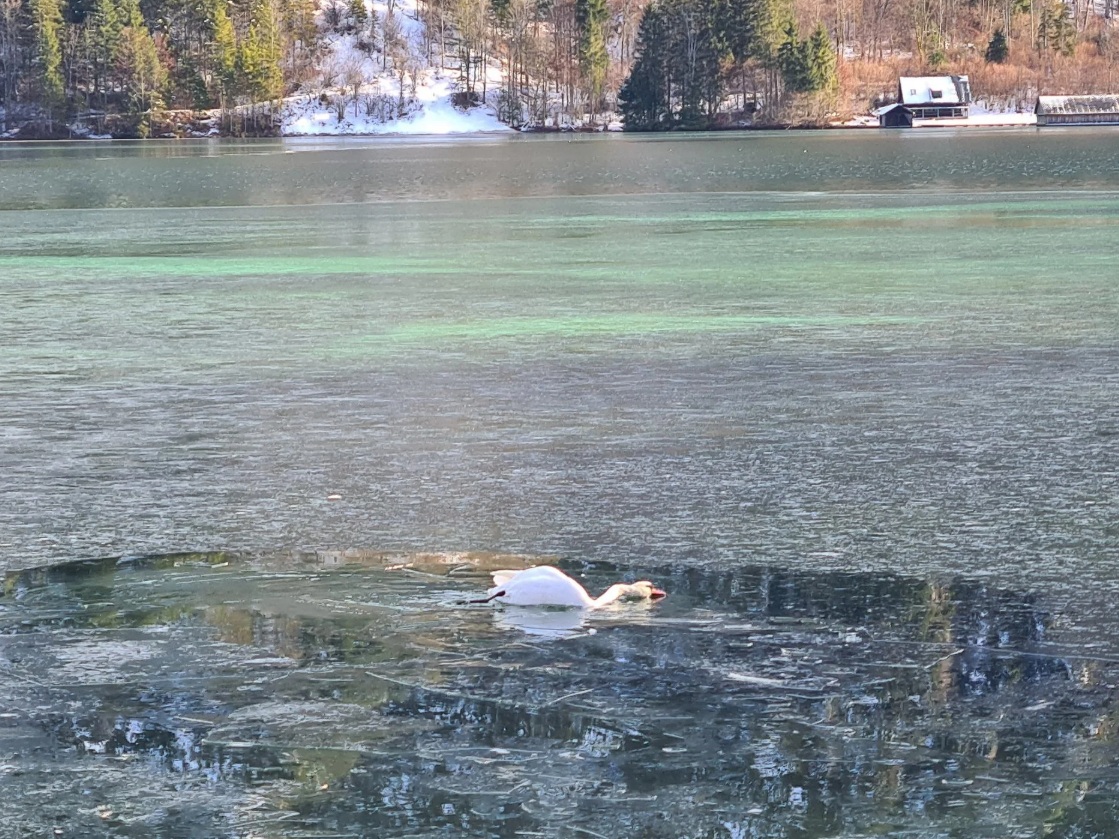 Feuerwehr rettete Schwan aus zugefrorenem Almsee