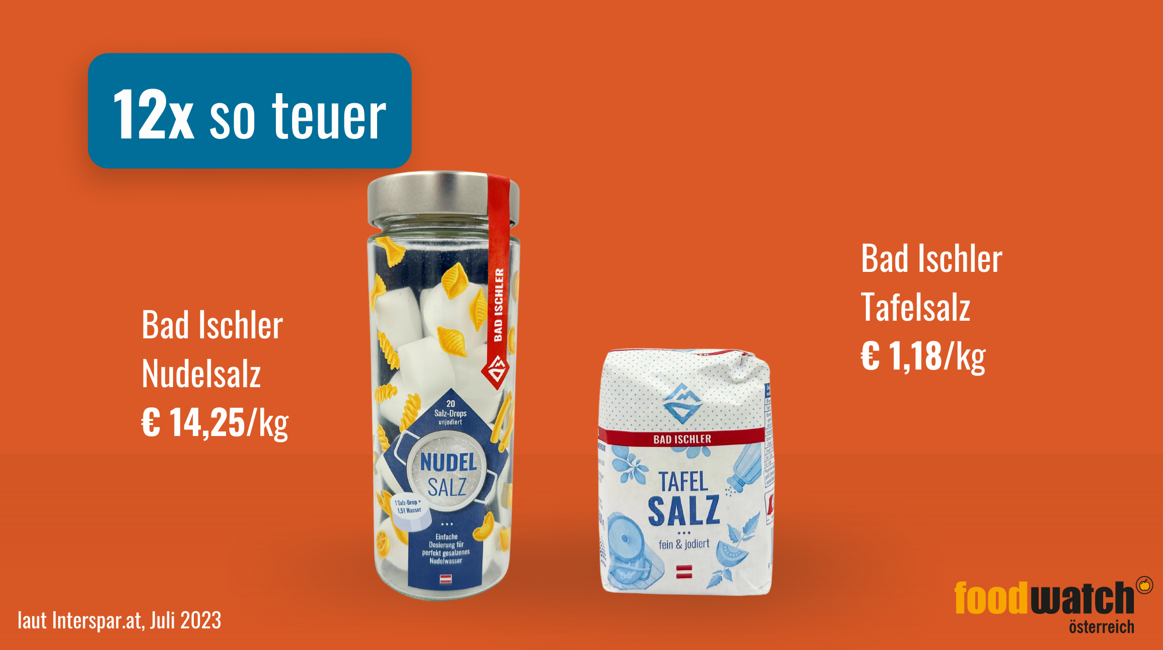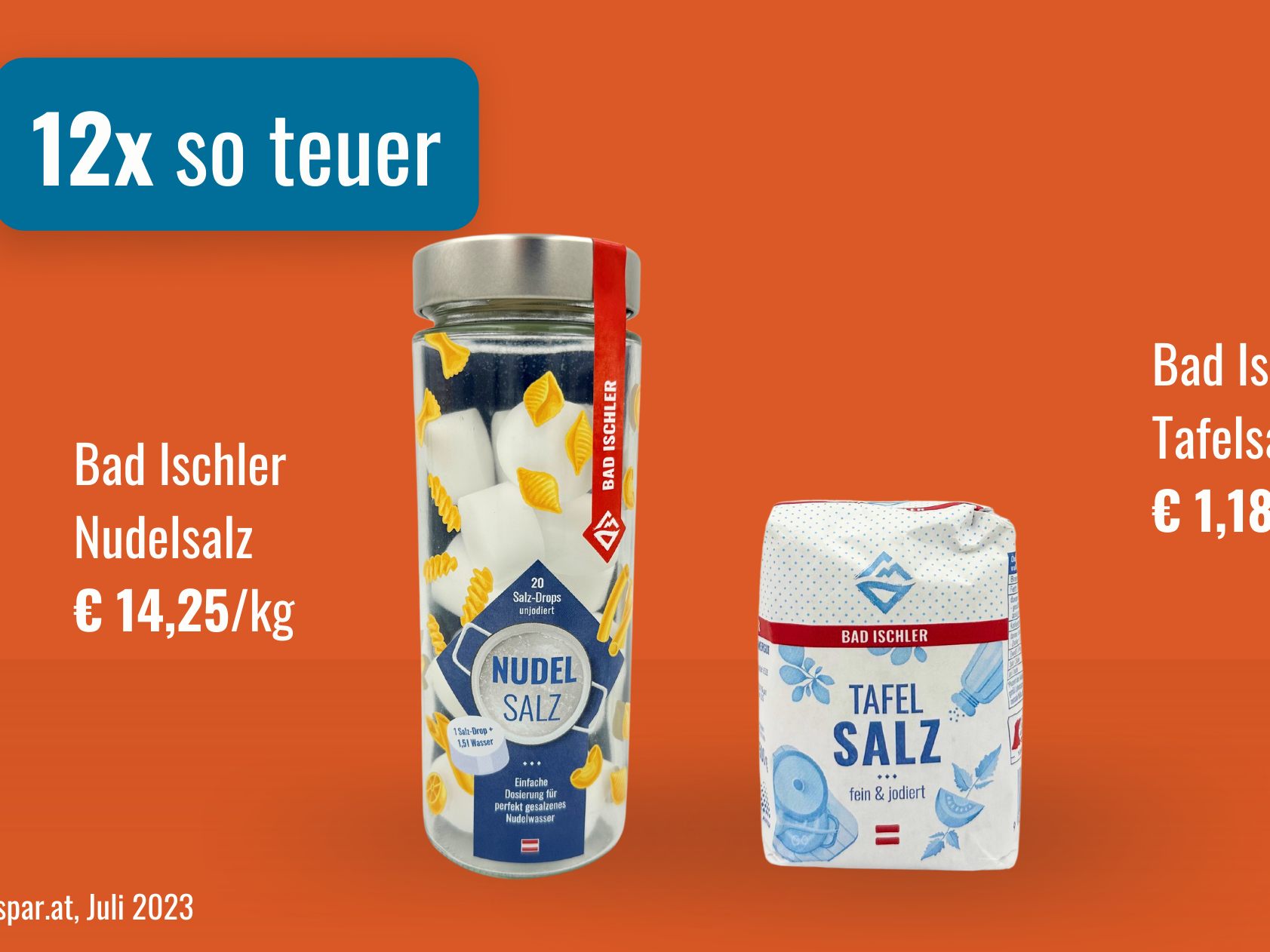 (1) Für den Preisvergleich wurde der Spar Onlineshop herangezogen, abgerufen am 28.7.2023: [Bad Ischler Tafelsalz] (https://bit.ly/3QanseK) 500 g: 0,59 € (1,18 €/kg), [Bad Ischler Nudelsalz] (https://bit.ly/3q6aT9y) 20 Stück (280 g): 3,99 € (14,25 €/kg)