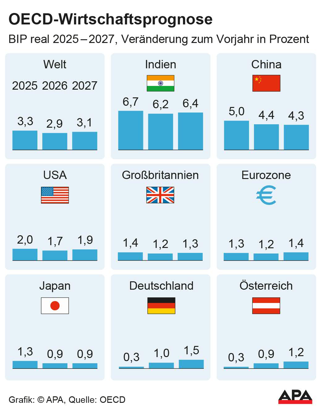 Die OECD prognostiziert, dass sich die österreichische Wirtschaft in den nächsten zwei Jahren leicht erholen wird. Nach einem BIP-Wachstum von 0,3 Prozent in diesem Jahr wird für 2026 ein Anstieg um 0,9 Prozent und für 2027 um 1,2 Prozent erwartet. Diese Werte liegen unter den früheren Prognosen und auch unter dem internationalen Durchschnitt.