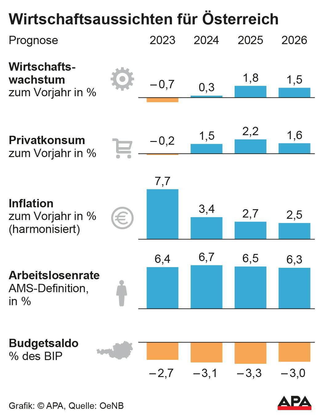 Die Wirtschaft dürfte sich aus Sicht der Nationalbank heuer etwas erholen, allerdings nur schleppend. Dazu beitragen sollten steigende Reallöhne, die den privaten Konsum ankurbeln, sowie zunehmende Exporte. Für die beiden kommenden Jahre rechnet die OeNB dann mit einer Beschleunigung des BIP-Wachstums, und zwar auf plus 1,8 Prozent (2025) und plus 1,5 Prozent (2026). Als unterstützende Faktoren nennt sie einen deutlichen Anstieg im realen Konsum und eine Verbesserung des außenwirtschaftlichen Umfeldes.