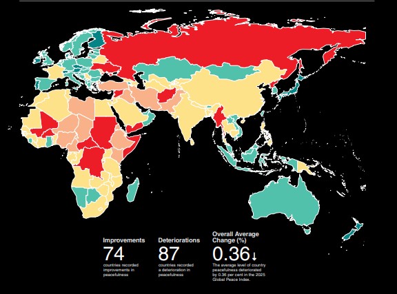 Der Global Peace Index 2025, veröffentlicht vom australischen Institute for Economics & Peace (IEP), belegt einen besorgniserregenden Trend: Die weltweite Friedenslage hat sich dramatisch verschlechtert. Die aktuelle Analyse umfasst 163 Staaten und deckt 99,7 % der Weltbevölkerung ab.
