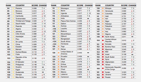 Demnach befindet sich der Weltfrieden auf dem niedrigsten Stand seit Einführung des Index vor 19 Jahren. Die Bedingungen, die bewaffneten Konflikten vorausgehen, seien laut dem Bericht so schlecht wie seit dem Zweiten Weltkrieg nicht mehr.