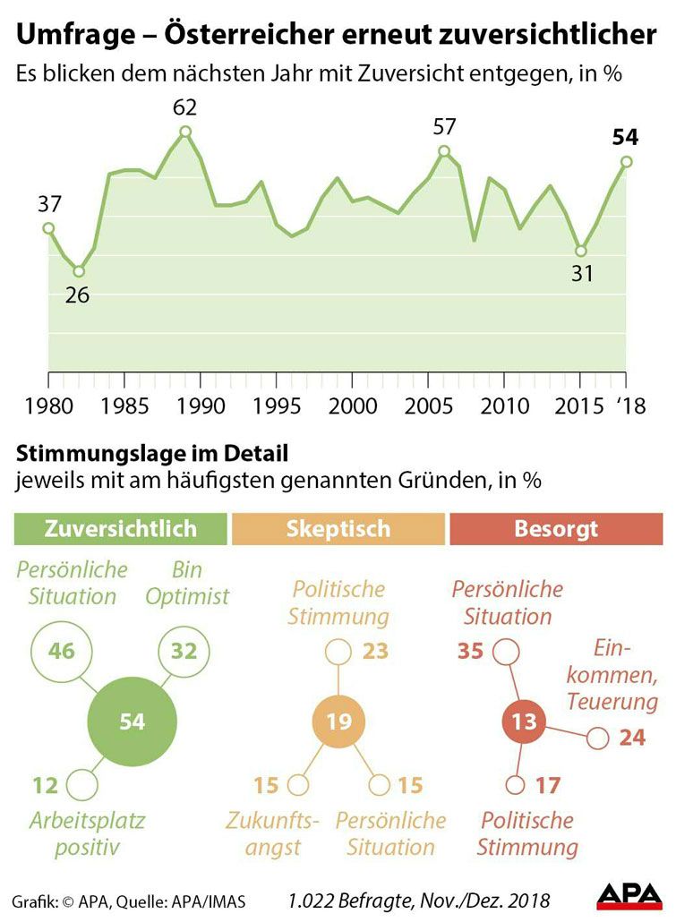Die Stimmung der Österreicher zum Jahreswechsel wurde heuer bereits zum 47. Mal erhoben. Die Tiefpunkte in der langjährigen Umfragereihe wurden 1973 mit nur 28 Prozent Optimisten und 64 Prozent Pessimisten und 1982 mit 26 Prozent positiv, aber 64 Prozent negativ eingestellten Personen registriert. Das Stimmungshoch gab es 1989: 62 Prozent Zuversichtliche standen 29 Prozent gegenüber, die skeptisch oder besorgt waren.