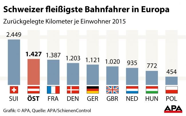 Hinter Österreich finden sich Frankreich mit 1.387 km pro Kopf und Jahr, Schweden mit 1.293 km und Dänemark mit 1.203 km pro Kopf. Deutschland liegt mit 1.121 km erst an sechster Stelle der verglichenen Länder. Besonders wenig Bedeutung hat die Bahn in Griechenland mit 78 km pro Kopf und im Kosovo mit nur 6 km pro Kopf. Der Schnitt der verglichenen europäischen Länder liegt bei 937 Bahnkilometern pro Kopf.