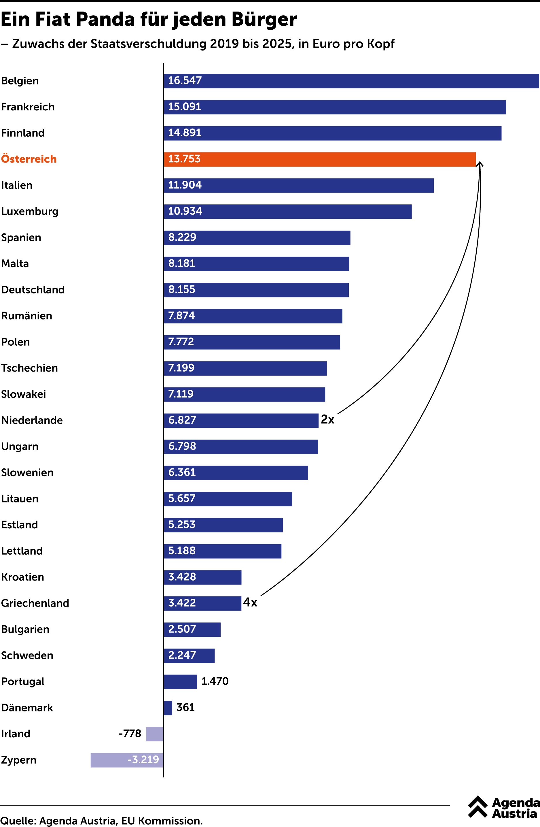 Die wirtschaftsliberale Denkfabrik Agenda Austria hat aktuelle Daten zur Entwicklung der Staatsschulden in Europa veröffentlicht. Demnach ist die Verschuldung in Österreich zwischen 2019 und 2025 um 13.753 Euro pro Einwohner gewachsen. Nur Belgien, Frankreich und Finnland verzeichnen höhere Zuwächse.