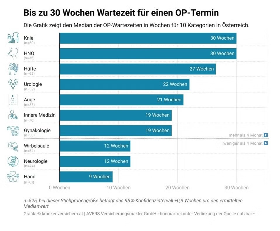Eine neue Untersuchung von krankenversichern.at hat die Wartezeiten für geplante Operationen in Österreichs öffentlichen Spitälern analysiert – mit ernüchterndem Ergebnis. Von Ende September bis Anfang November wurden 525 Terminrückmeldungen gesammelt. Die Auswertung zeigt: In sieben von zehn medizinischen Kategorien liegt die durchschnittliche Wartezeit bei mehr als vier Monaten. Besonders betroffen sind Patientinnen und Patienten, die auf Eingriffe am Knie oder im HNO-Bereich warten – hier beträgt der Median 30 Wochen, also rund sieben Monate.