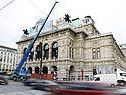Einiges an Logistik fordert der Aufbau der Bühnenlogen: 70 Lkw-Fuhren sind nötig, um die über sieben Meter hohen Elemente, in denen am Ball rund 500 Gäste Platz finden, in die Oper zu transportieren. 30 zusätzliche Fuhren sind für die Errichtung des Zeltes notwendig.