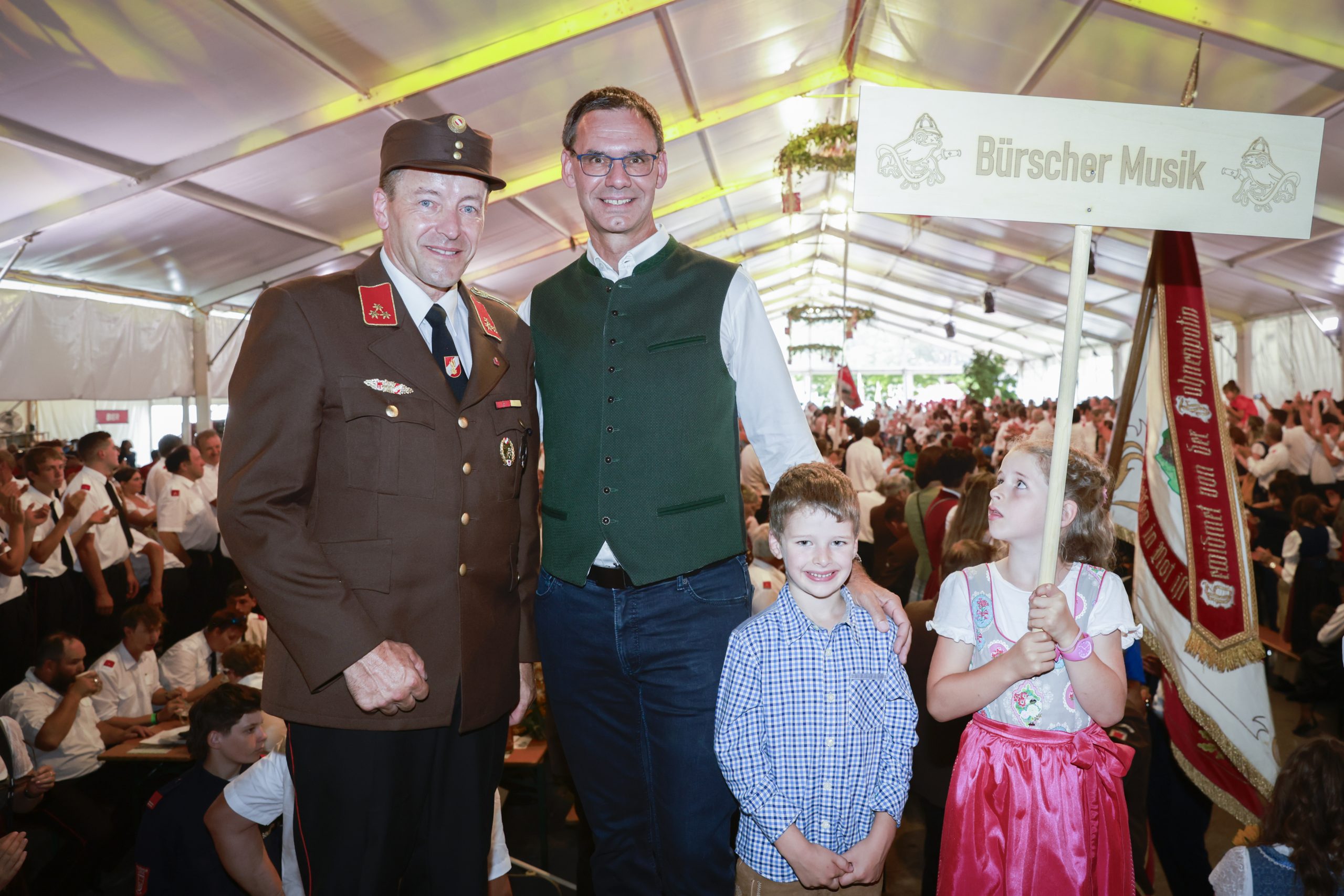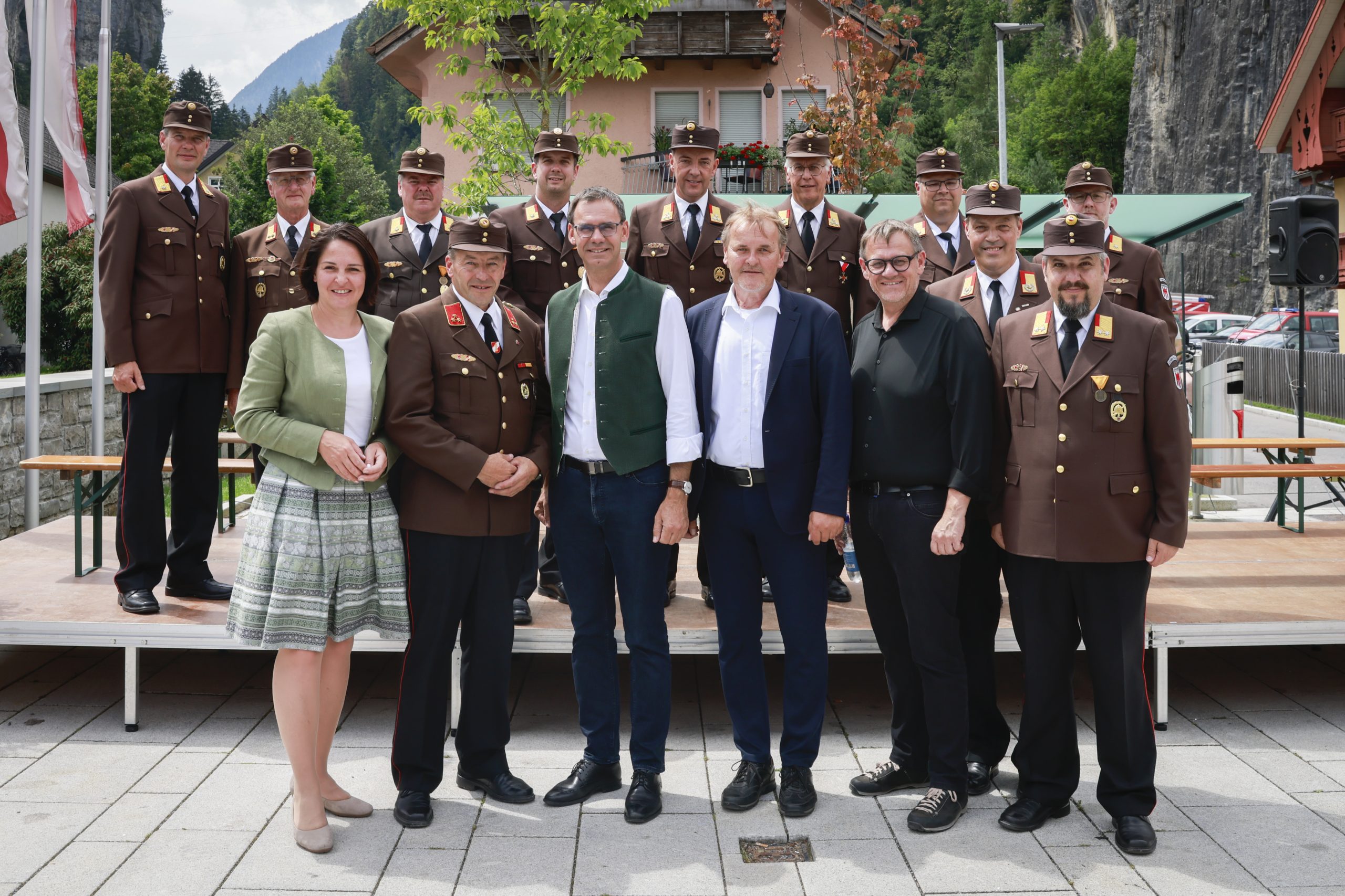 Besonders herzlich gratulierten Wallner und Gantner der Ortsfeuerwehr Bürs mit Kommandant Raimund Rauch zu ihrem runden Jubiläum: Sie lieferte mit ihrem 140-jährigen Bestehen den Anlass für das Bezirksfeuerwehrfest und organisierte mit zahlreichen HelferInnen die gesamte Veranstaltung.