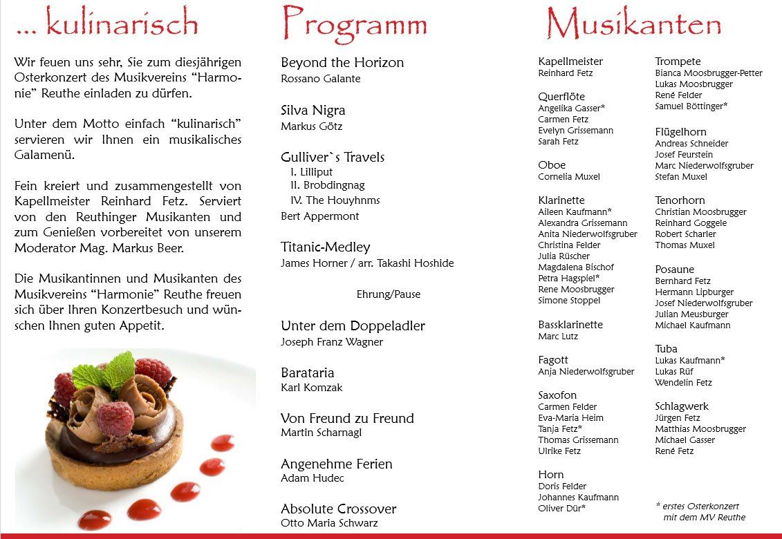 Unter dem Motto “… einfach ‘kulinarisch'” servieren die Reuthinter Musikanten im Gemeindesaal Reuthe ein musikalisches Galamenü. Fein kreiert und zusammengestellt von Kapellmeister Reinhard Fetz und frisch zum Genießen vorbereitet von Moderator Mag. Markus Beer. Die Reuthinger Musikanten freuen sich über viele Konzertbesucher. Karten sind an der Abendkasse erhätlich.