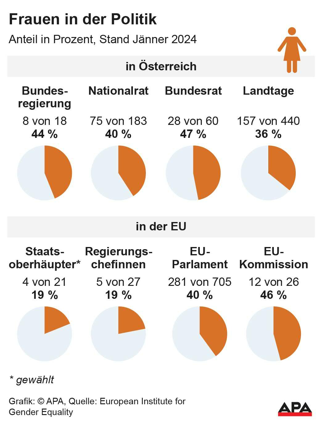 Im Nationalrat bekleiden vier von zehn Abgeordneten Frauenämter, was einem Anteil von 40 Prozent entspricht. Bei den österreichischen EU-Abgeordneten, die im Juni neu gewählt werden, ist der Frauenanteil noch geringer und beläuft sich auf 37 Prozent.