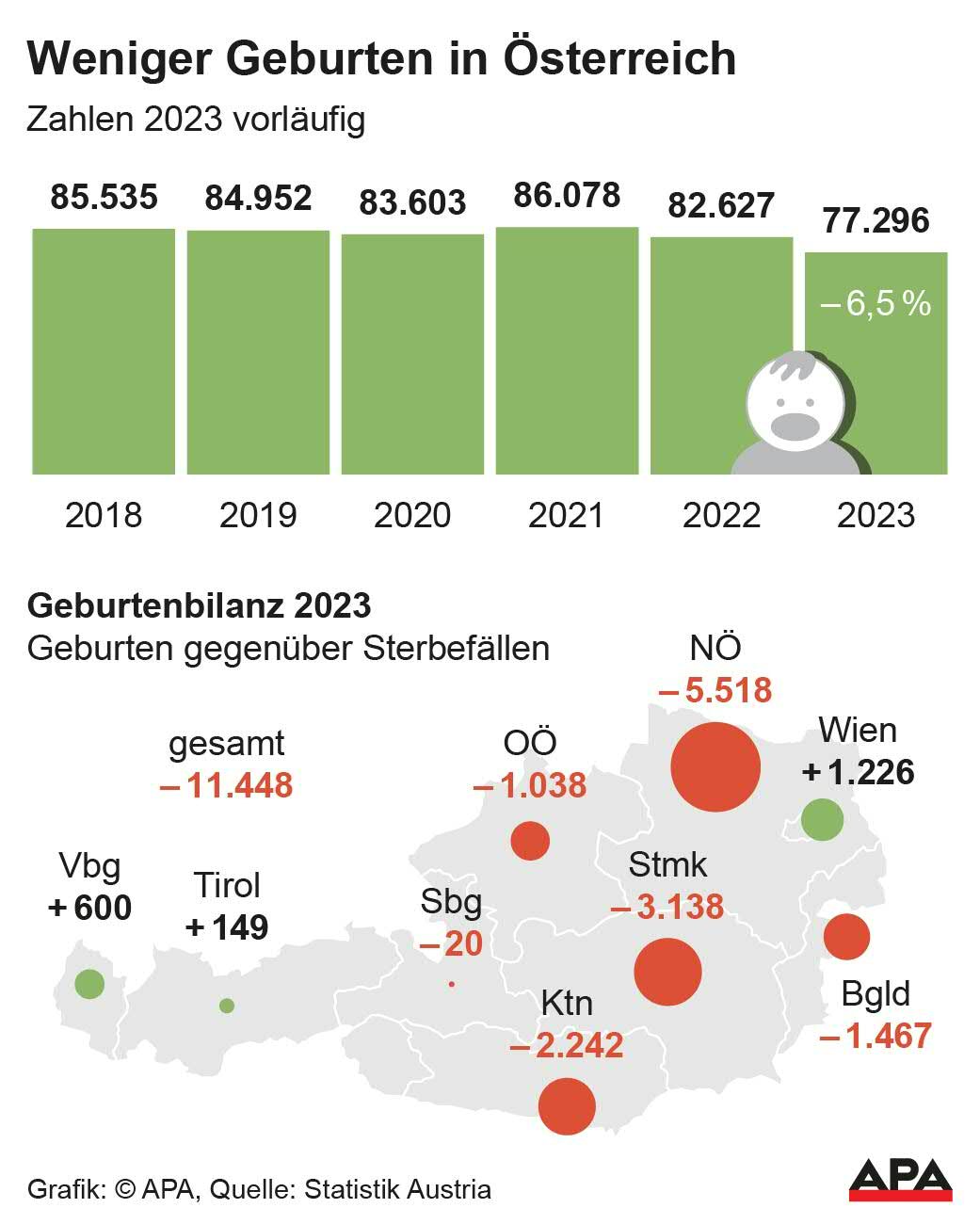 Die heimischen Geburten befinden sich weiterhin im Sinkflug: Im Vorjahr wurden nach den vorläufigen Zahlen der Statistik Austria 77.296 Geburten registriert, das sind 6,5 Prozent weniger als 2022 und sogar 10,2 Prozent weniger als der Durchschnitt der Vor-Pandemie-Jahre 2015 bis 2019, hieß es am Dienstag. Demgegenüber stehen 88.744 Sterbefälle, womit 11.448 weniger Menschen geboren als gestorben sind. Damit weist Österreich zum vierten Mal in Folge ein Geburtendefizit auf.