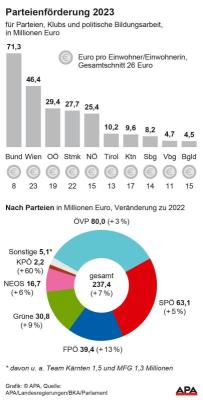 In Summe haben Parteien, Parlamentsklubs und politische Akademien 237,4 Mio. Euro erhalten, wie Recherchen der APA ergaben. Das ist ein Anstieg um 6,9 Prozent gegenüber 2022 und entspricht 26 Euro pro Einwohner. Die Fördergelder unterstützen die politische Arbeit der Parteien sowie ihrer Parlaments- und Landtagsklubs. Sie steigen meist mit der Inflation oder den Beamtengehältern.