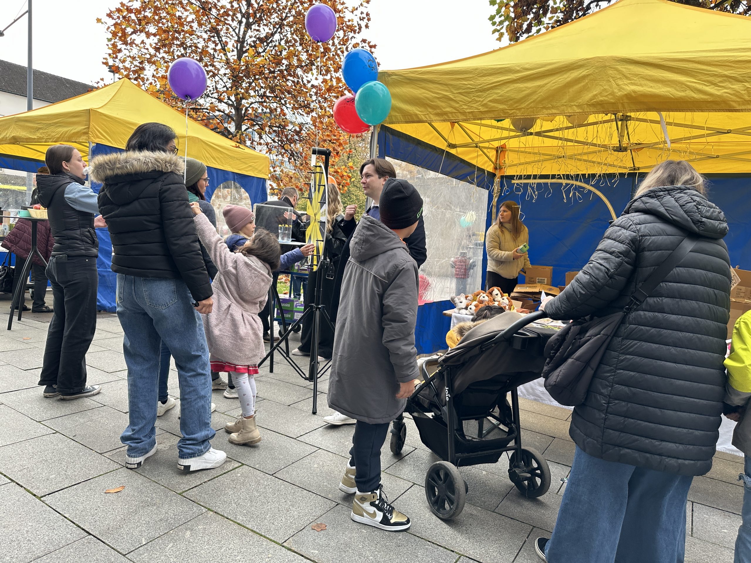 Die Raiffeisenbank setzte auf ein vielfältiges Programm: Neben Kinderschminken, bei dem die Kleinen sich fantasievoll bemalen ließen, gab es auch Marktstände vor dem Gebäude. Dort gab es neben Getränken und einem Glücksrad natürlich auch die bei Kindern beliebten Geschenke fürs "Kässele-leeren". Die Kindern konnten sich etwa ein Kuscheltier, Brettspiele oder eine Taschenlampe aussuchen. Ein kleines Zügle drehte zudem seine Runden vor der Raiba.