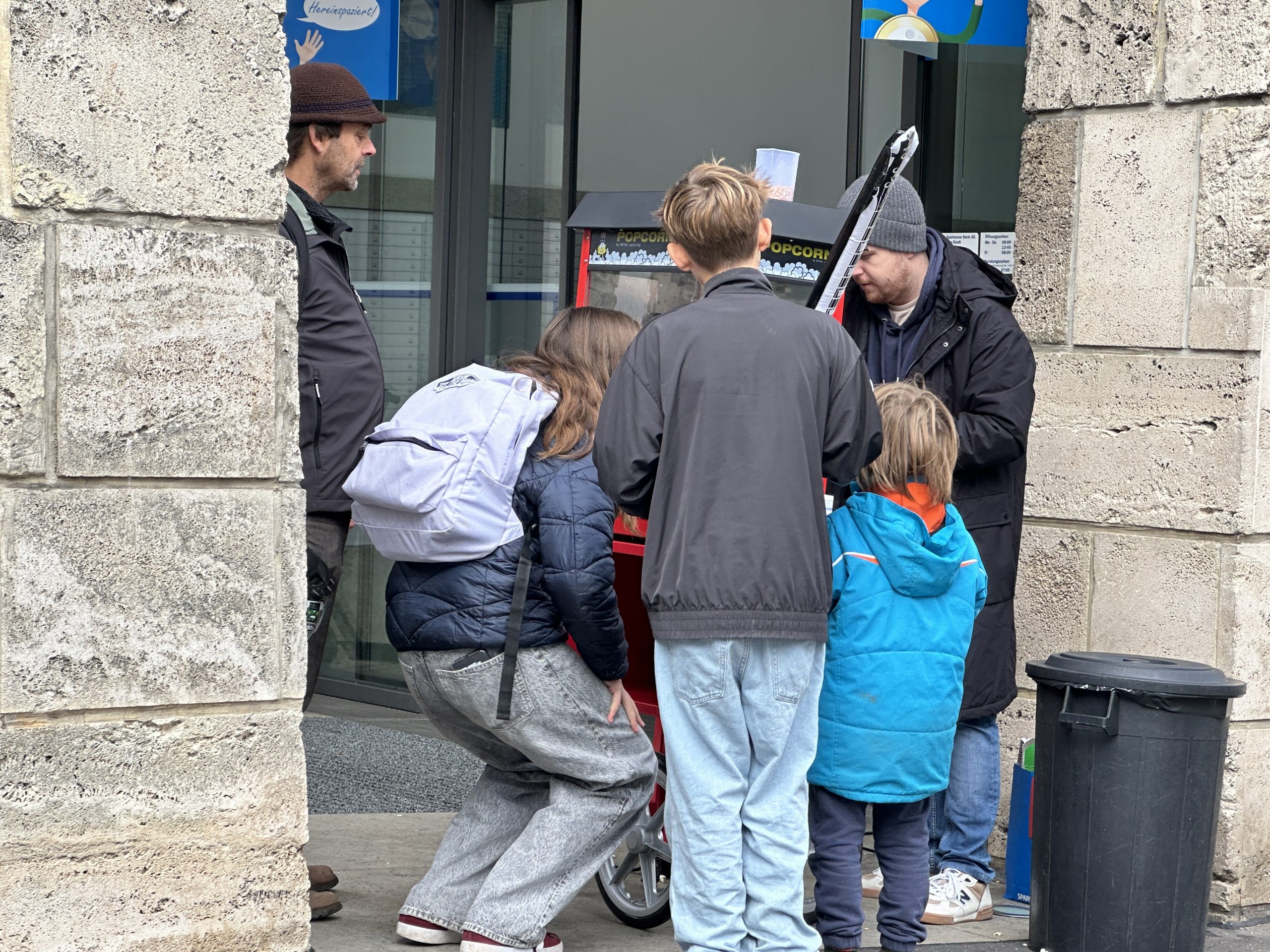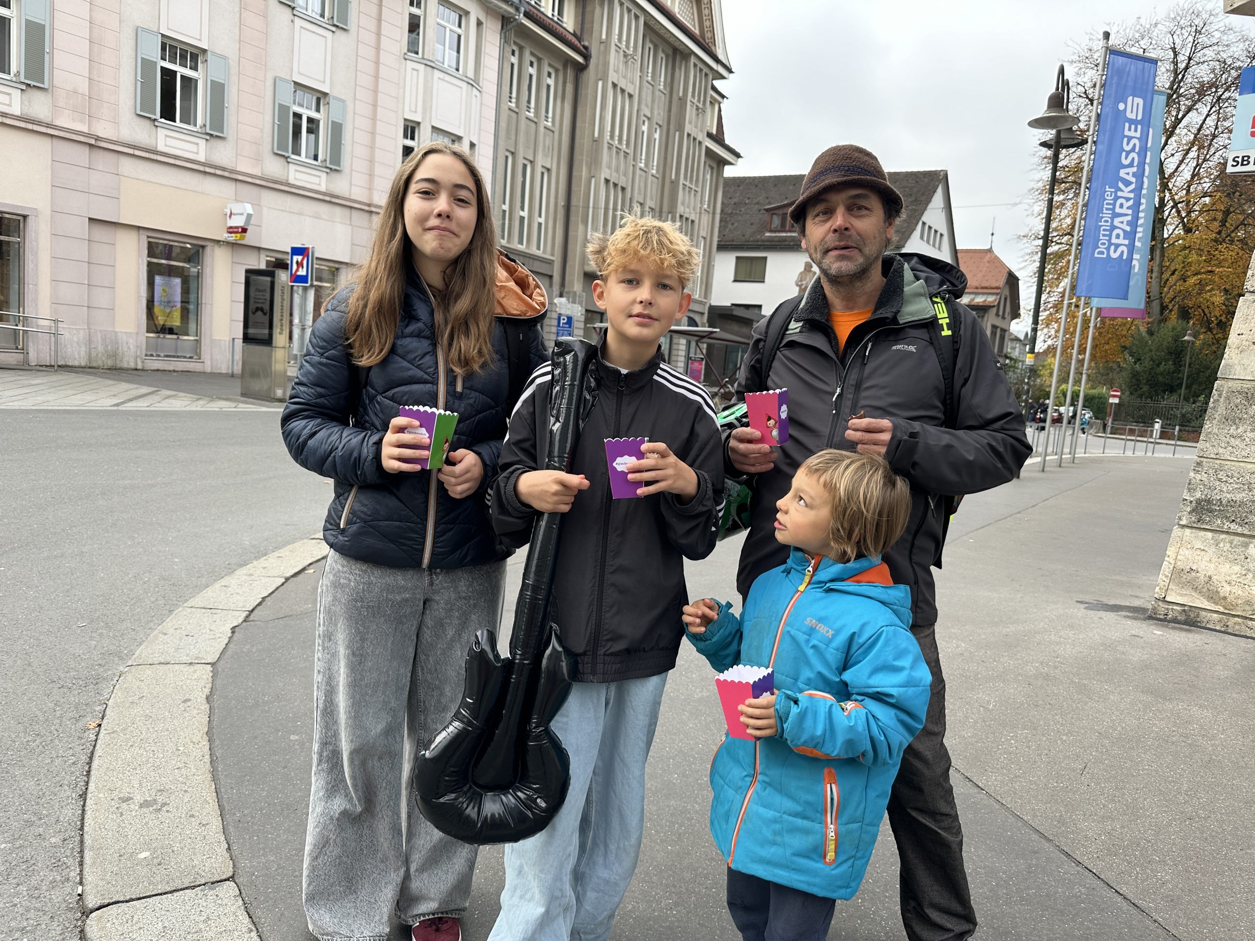 Vor der Sparkasse traf VOL.AT Ulrich Schwendinger mit Paul, Tabea und Emil. Der zwölfjährige Paul hat bereits ein klares Ziel für seine Ersparnisse: "Ich spare auf einen Gaming-PC", erklärt er. im Gespräch mit VOL.AT. Der Bursche sicherte sich zusätzlich zu einer Tüte Popcorn auch eine aufblasbare Gitarre.