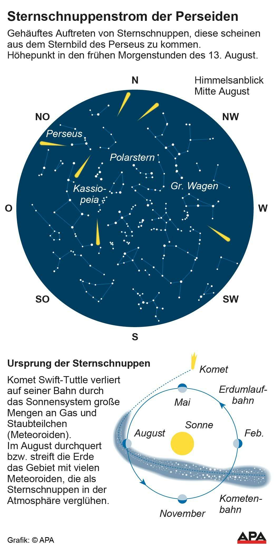 Der Blick sollte Richtung Nordosten gerichtet sein. Am besten sieht man sich das Spektakel unter freiem Himmel - sprich außerhalb von Städten beispielsweise auf Feldern und Wiesen - und abseits von Lichtverschmutzung an. Spezielle Utensilien sind nicht notwendig - Experten raten, sich den Perseiden-Regen mit freiem Auge anzusehen.