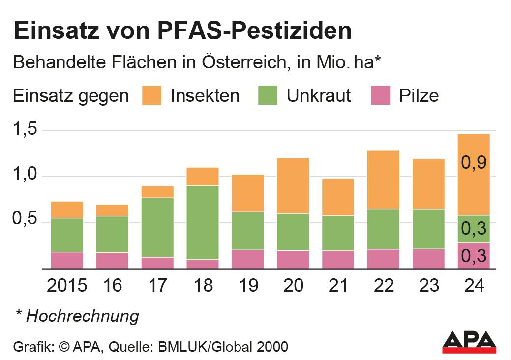 With the active ingredient-specific data published in response to the inquiry, Global 2000, on behalf of the Greens, calculated how many hectares can be treated with the sold substances. "For the first time, we now know the true state of pesticide use in Austria, and the results are dramatic," Voglauer stated. The potentially pesticide-treated area calculated has increased by 22 percent from 2010 to 2024 and currently amounts to 7.5 million hectares. However, the calculated area with substitution candidate active ingredients increased by about 106 percent from 1.35 million to 2.78 million hectares in the same period, and those with PFAS active ingredients increased by over 175 percent, tripling from 0.53 million to 1.46 million hectares.
