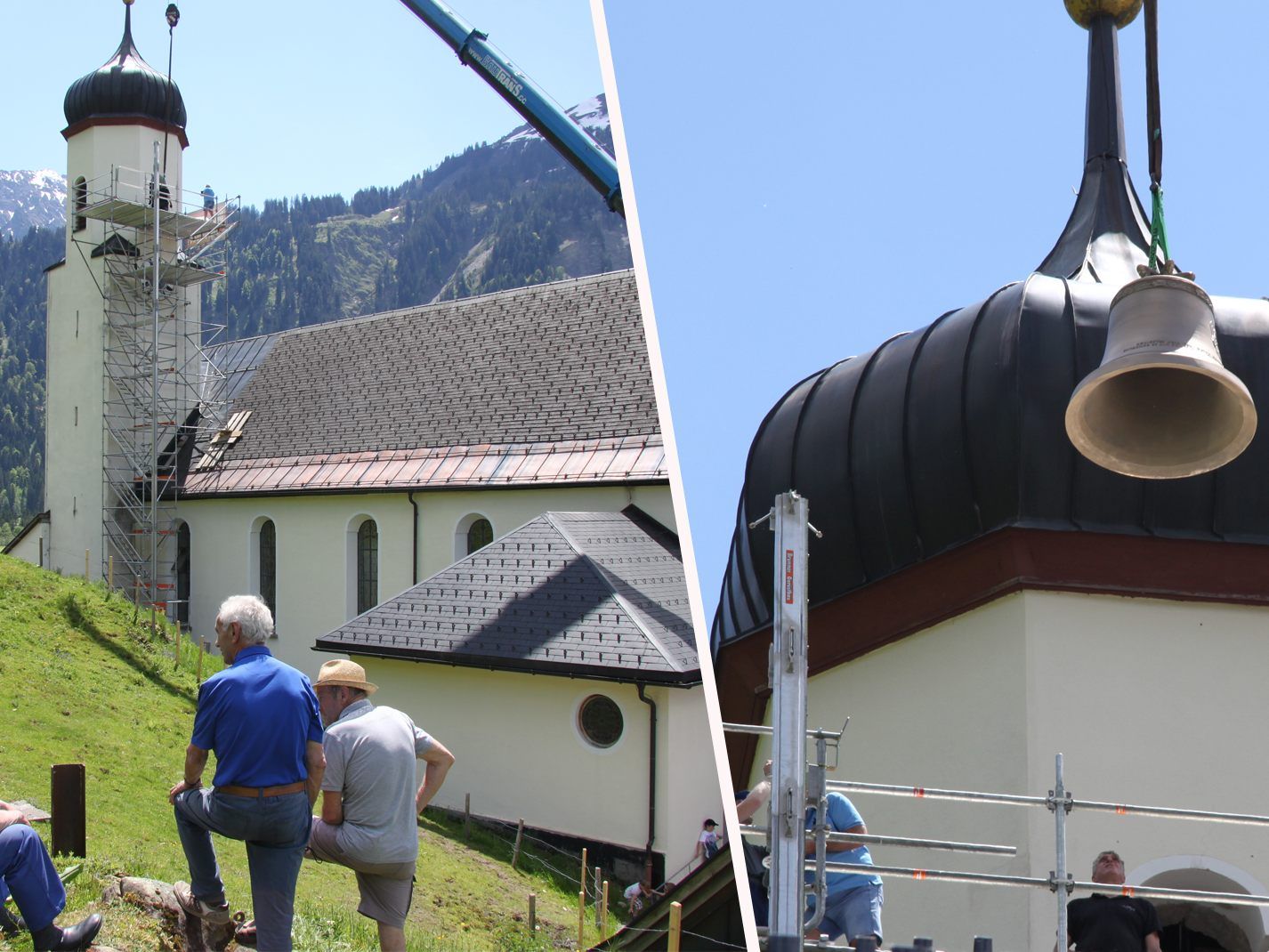 Rund 100 Jahre lang musste sich die Pfarre Schoppernau mit einfachen Stahlglocken zufrieden geben. Endlich bekommt die Pfarrkirche wieder ein würdiges Geläute: Das alte Glocken-Provisorium aus Stahl wurde bereits Anfang Mai abmontiert. Das an Christi Himmelfahrt durch Bischof Benno Elbs geweihte neue Glockenquartett, bestehend aus Sonntagsglocke, Angelusglocke, Wetterglocke und Totenglocke, fand am Montagnachmittag seinen Platz im Glockenturm.