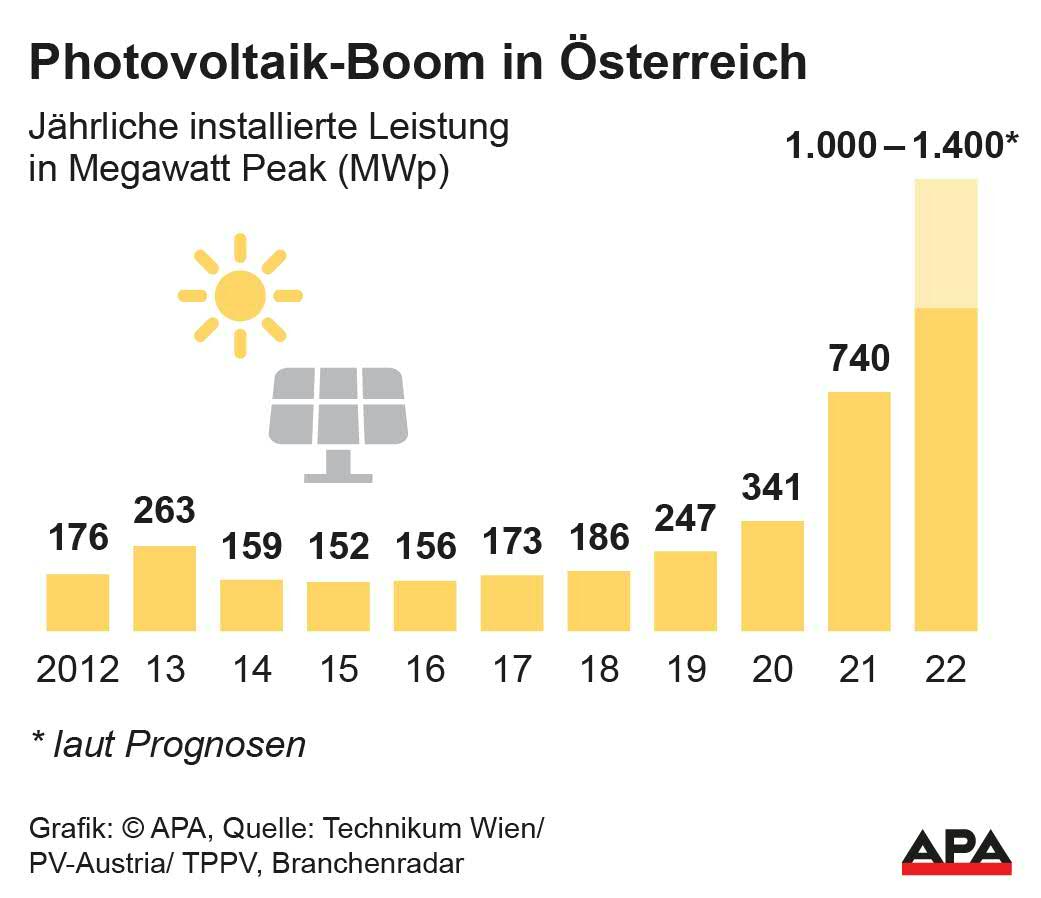 Der Branchenverband Photovoltaic Austria geht in einer internen Prognose von rund 1.200 Megawatt aus. Über 1.000 Megawatt Peak, also ein Gigawatt, gelten als fix, wie es von PV Austria zur APA hieß. Die Technologie Plattform Photovoltaik (TPPV) geht ebenfalls von einem Zubau von 1 bis 1,2 Gigawatt Peak (GWp) aus. Die Marktanalysefirma Branchenradar schätzte die 2022 neu installierte Leistung zuletzt sogar auf 1,37 GWp.
