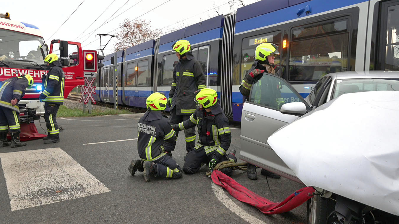 Beim Eintreffen der Einsatzkräfte stand die Badener Bahn über dem Bahnübergang und Haltestellenbereich Tribuswinkel still. Fahrgäste waren noch im Zug. Ein Pkw war zwischen dem Zug, einer umgerissenen Lichtsignalanlage und einem Signalmast eingeklemmt. Der Fahrer im Auto war bei Bewusstsein und nicht eingeklemmt, hatte jedoch Fußschmerzen. Der Beifahrer befand sich bereits im Rettungsfahrzeug. Der Pkw wurde zur schonenden Befreiung des Fahrers mit einer Seilwinde seitlich weggezogen.