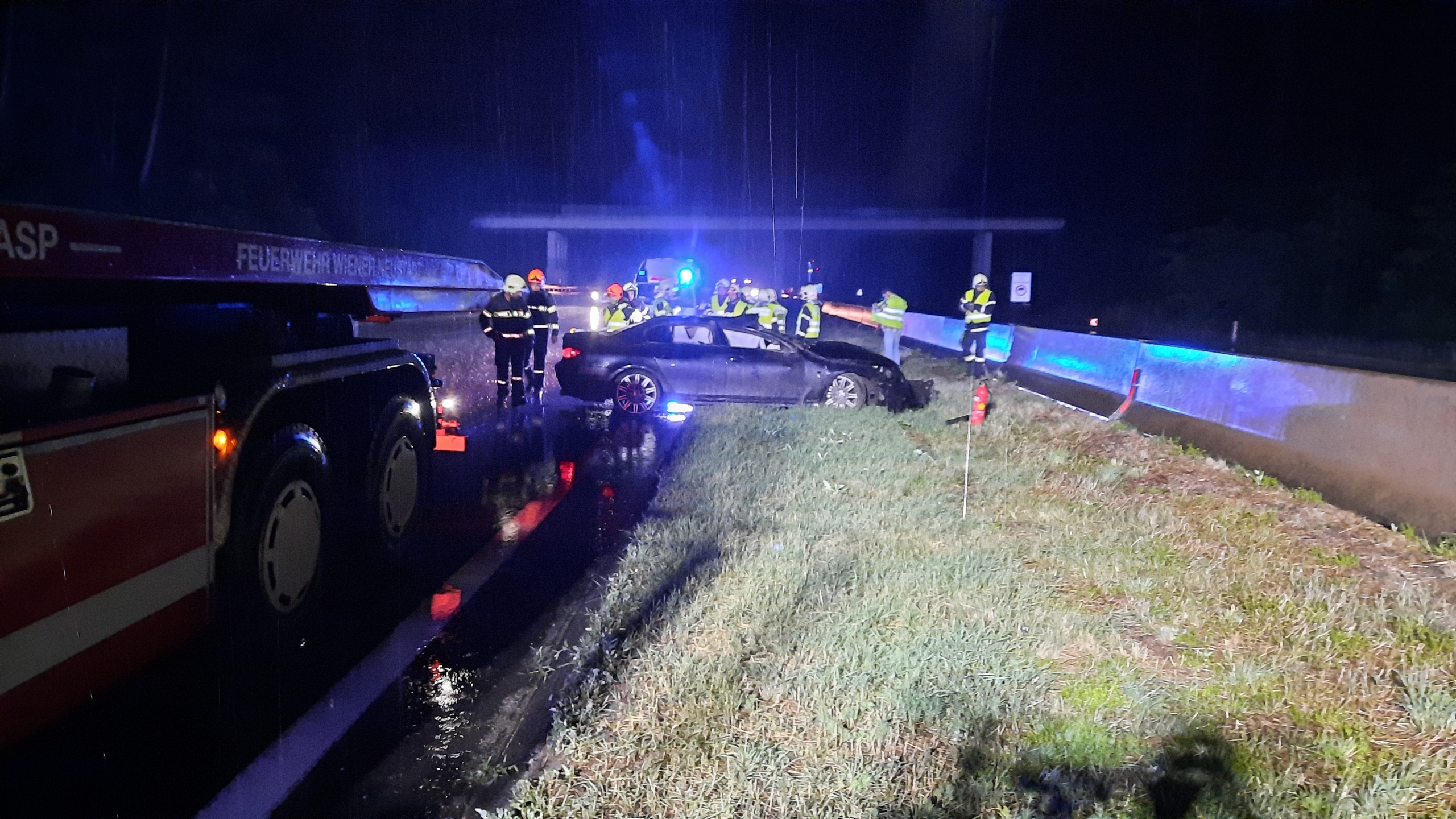 Kurz nach 1.00 Uhr wurde die FF Wiener Neustadt am 26. Juli wegen einer eingeklemmten Person auf der Südautobahn in Fahrtrichtung Wien alarmiert. Ein Fahrzeug hatte sich bei schwerem Regen mehrfach auf der nassen Fahrbahn überschlagen.