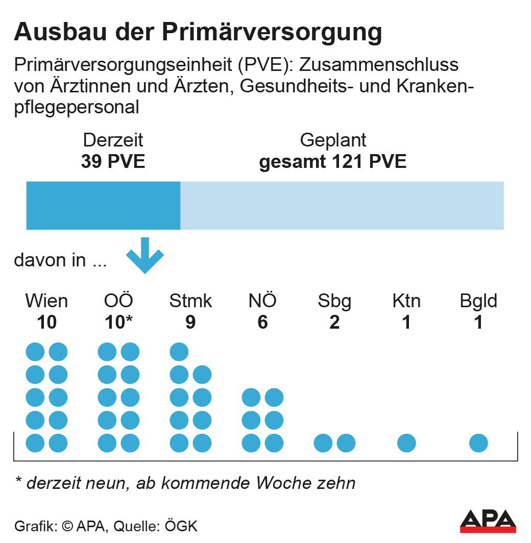 Die ÖGK begrüße den Vorstoß zur Lockerung des Primärversorgungs-Gesetzes, heißt es in einer Aussendung am Donnerstag. PVE seien "das Modell der Zukunft, das auch von jungen Ärztinnen und Ärzten sehr gut aufgenommen wird". Diese würden lieber in Teams zusammenarbeiten, die Möglichkeit mit einem PVE in den Kassenvertrag einzusteigen und so ein sicheres Einkommen zu haben, wiege das unternehmerische Risiko einer Praxisgründung auf und mache das Modell PVE noch attraktiver, so die Gesundheitskasse. Aktuell gibt es in Österreich 39 solche Primärversorgungseinheiten.