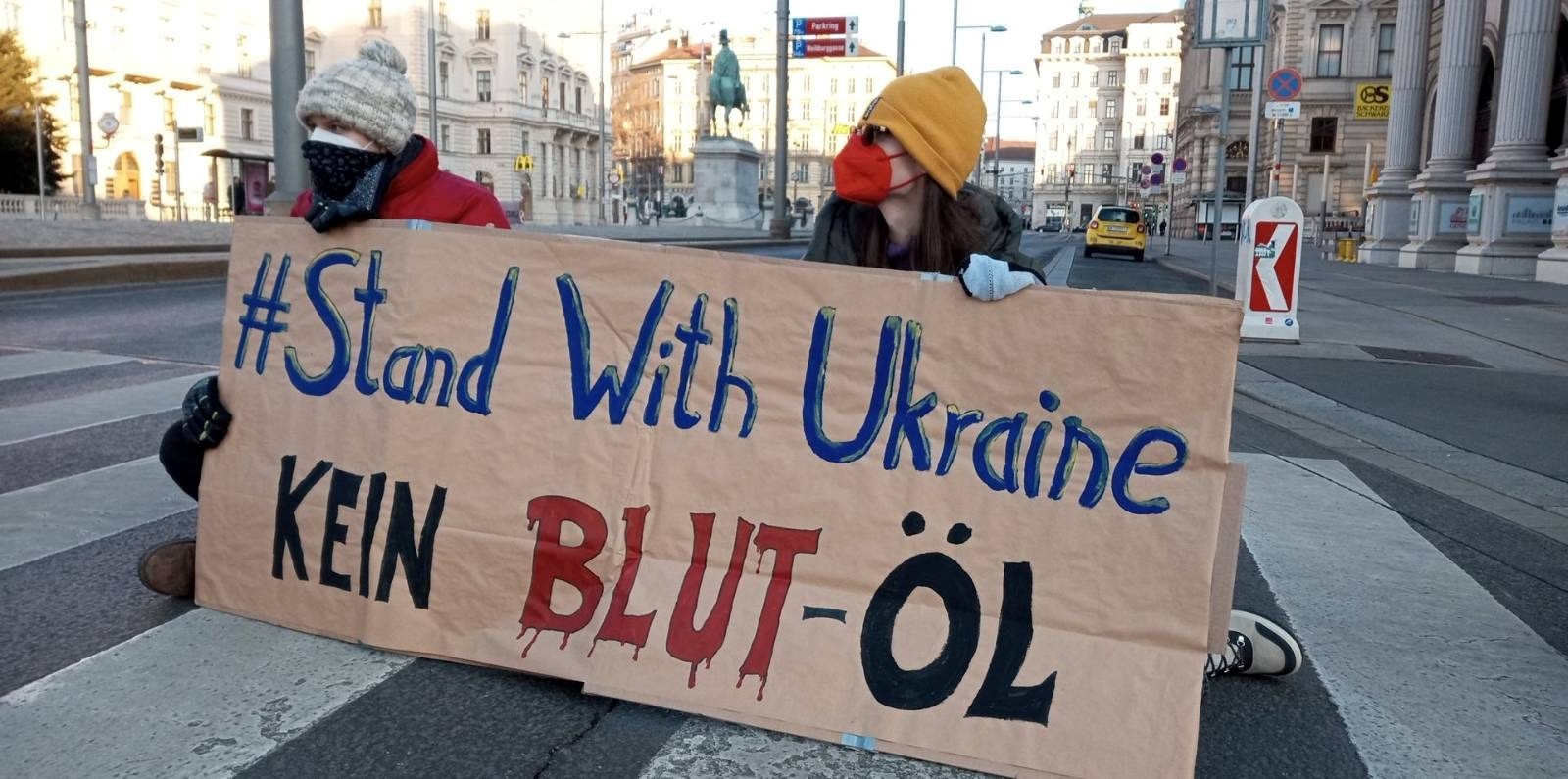 Aus Protest gegen den Krieg in der Ukraine und dass immer noch Öl und Gas aus Russland nach Österreich importiert werden, hat eine Handvoll Aktivisten von #StandWithUkraine Austria Montagfrüh die Kreuzung Schwarzenbergplatz/Lothringerstraße blockiert.
