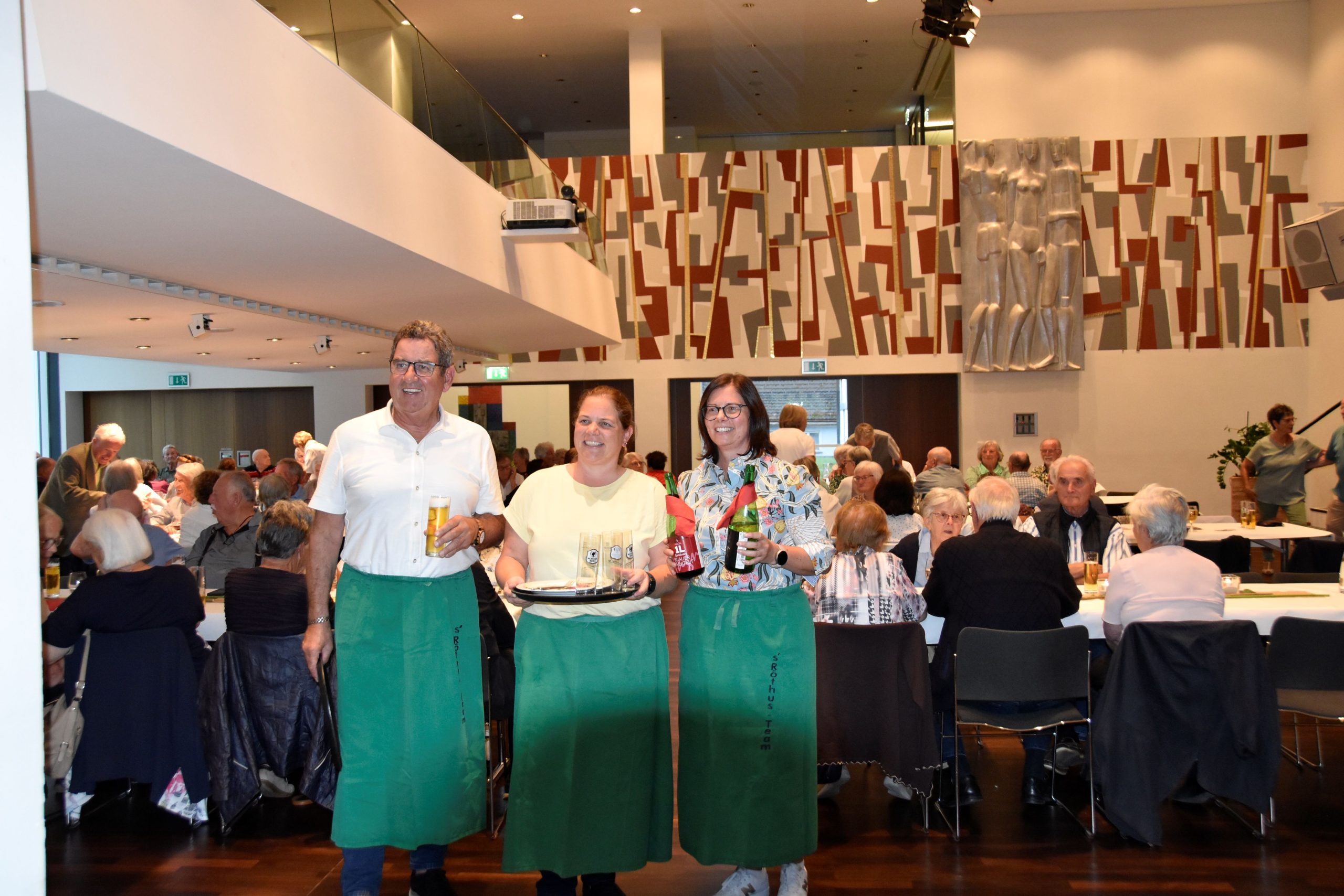 Den Abschluss des gelungenen Ausflugs bildete ein gemütliches Beisammensein im Vinomnasaal. Dabei ließen es sich die Bürgermeisterin Katharina Wöß-Krall, Gemeindeärztin Magdalena Wöß sowie die Gemeinderäte Andreas Prenn und Helmut Jenny nicht nehmen, die Kellner:innenschürzen umzubinden.