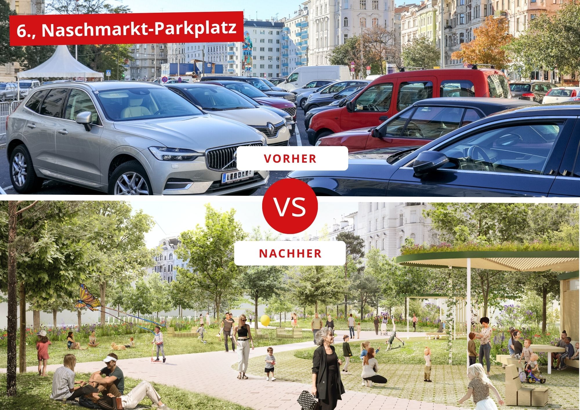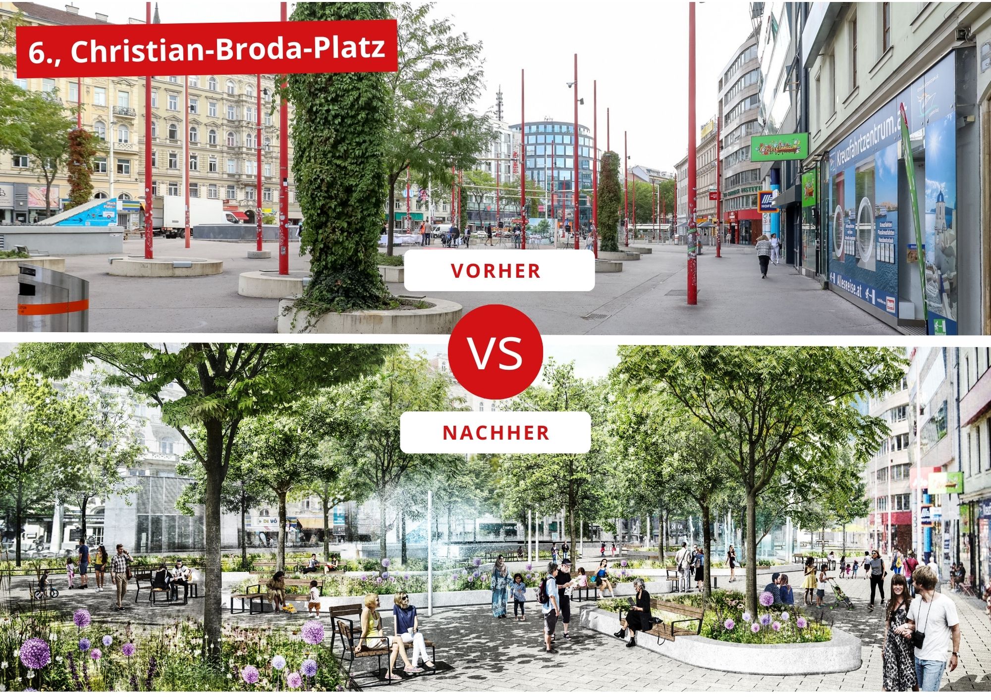 Der Christian-Broda-Platz im 6. Bezirk befindet sich momentan in einer Umbauphase und soll bis zum Ende des Jahres klimafreundlich gestaltet werden. Eine neue, helle Bepflasterung sowie 33 neu gepflanzte Bäume werden zukünftig zum Verweilen einladen. Die Fläche für Grünanlagen wird von 52 Quadratmetern auf 1.400 Quadratmeter ausgebaut. Ebenso wird die Bernardgasse im 7. Bezirk umgestaltet: Sie wird bald eine Wohngegend mit 36 neu gepflanzten Bäumen, Wasserstellen und Grasbeeten sein, deren Fertigstellung ebenfalls für das Jahresende geplant ist.