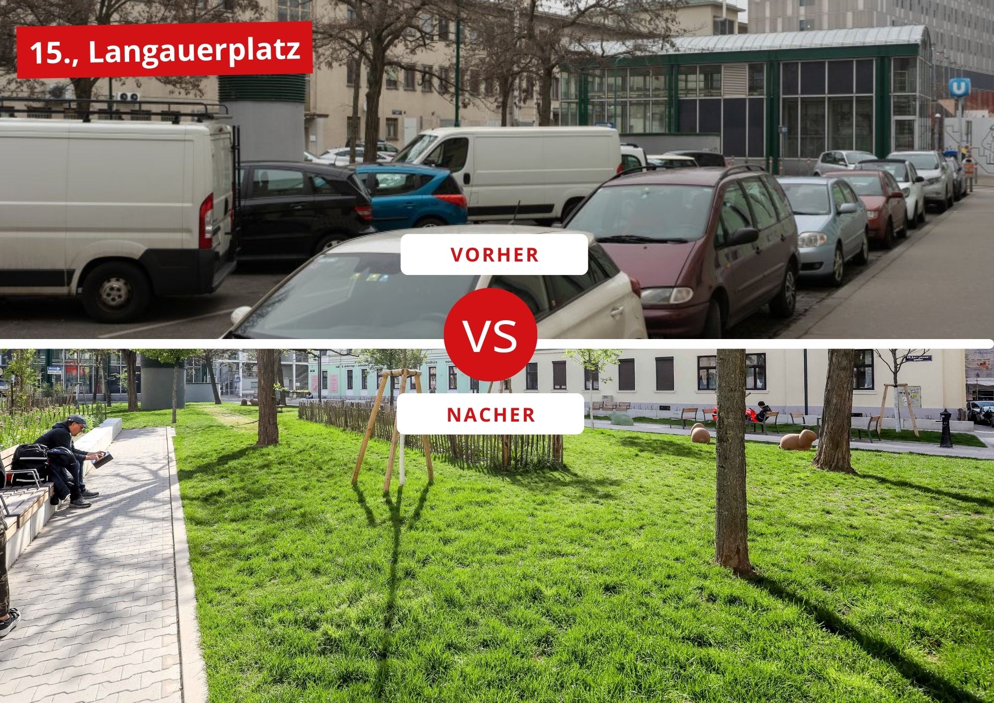 Der Langauerplatz im 15. Bezirk, früher ein Parkplatz hinter dem Westbahnhof, wurde erfolgreich renaturiert und präsentiert sich nun als kleine Oase für die lokalen Bewohner*innen. Die Flächen wurden dort entsiegelt und mit Grün versehen: Über eine Gesamtfläche von 15.000 qm wurden Nebenstraßen verkehrsberuhigt und begrünt, 13 neue Bäume, 16 farbenfrohe Beete und 13 frische Wasserstellen sorgen für Abkühlung.