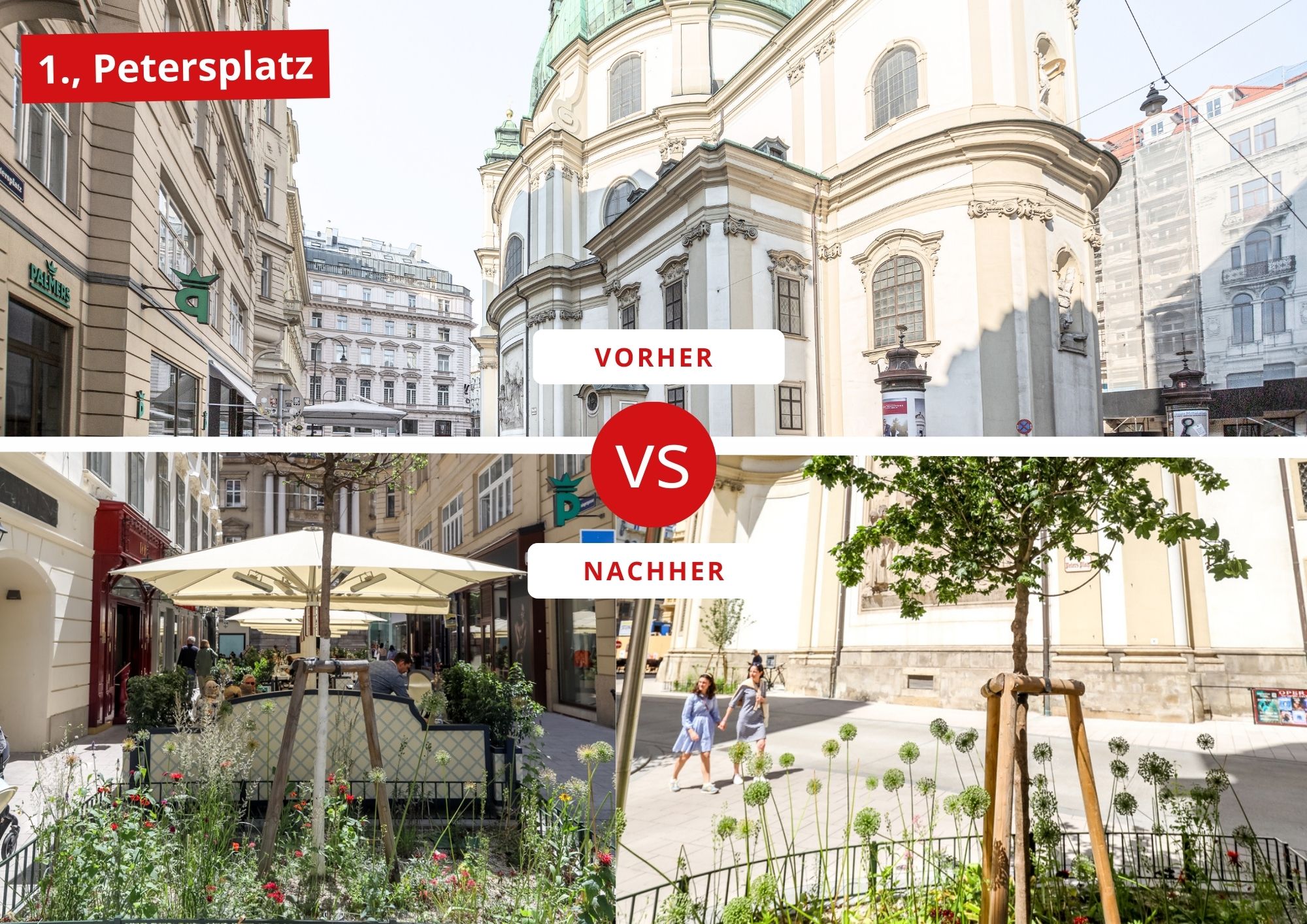 Der Petersplatz im ersten Bezirk erfährt zusammen mit den angrenzenden Straßen eine Neugestaltung, dabei wurden 18 neue Bäume und Beete mit Stauden gepflanzt, zusätzlich bieten fünf Nebelduschen Kühlung an warmen Tagen. Insgesamt sind 7.000 Quadratmeter nun verkehrsberuhigt und klimafit. Die Servitengasse im 9. Bezirk glänzt nun in neuem Licht: 11 frisch gepflanzte Bäume und 330 qm erweiterte Grünflächen bieten Kühlung.