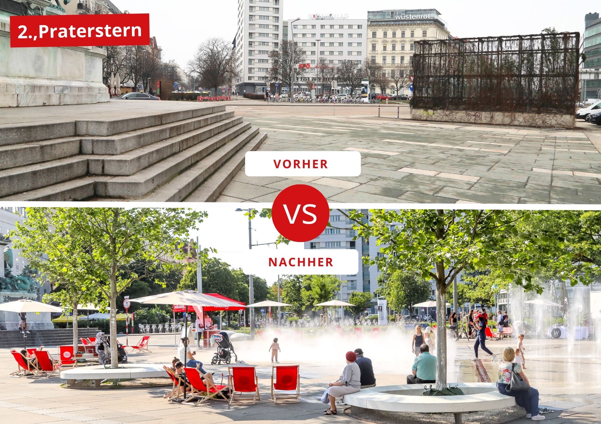 Bis zum Jahr 2025 investiert die Stadt mehr als 100 Millionen Euro aus dem Förderprogramm für eine „Lebenswerte Klimamusterstadt“, um Entsieglungs- und Begrünungsmaßnahmen in den Stadtteilen zu unterstützen. Überall dort, wo es möglich ist, werden Bäume gesetzt und Wasseranlagen errichtet. Ein Beispiel ist der Praterstern, welcher einer kompletten Neugestaltung unterzogen wurde - die Grünanlagen wurden auf 8.000 Quadratmeter verdoppelt, ebenso wie die Zahl der Bäume auf 100 verdoppelt wurde. Für Schatten sorgen 13 sogenannte XL-Bäume, die bei ihrer Einpflanzung bereits über 20 Jahre alt sind und somit sofort große Schattenkronen bieten. Ein 2,5 Meter breiter, mit bunten Blumen und Gräsern bepflanzter Ring umfasst auf 1.400 Quadratmetern den gesamten Praterstern. Außerdem bietet Wiens größte Wasserattraktion auf 500 Quadratmetern Erfrischung an warmen Tagen.