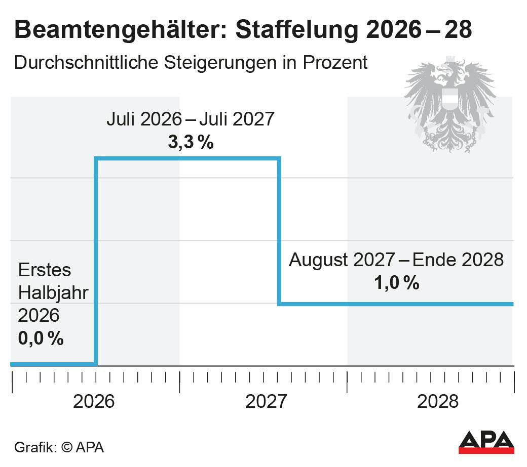 Der Gehaltsabschluss sieht folgendermaßen aus: Statt mit Jahresbeginn 2026 steigen die Gehälter nun ab Juli um 3,3 Prozent - das ist der schon gesetzlich vereinbarte Wert. Mit August 2027 kommt es dann zur nächsten Anpassung um im Schnitt ein Prozent. Umgesetzt wird das über Fixbeträge. Bis 3.010 Euro gibt es 58 Euro, in der nächsten Stufe bis 6.163 Euro gut 40 Euro und darüber knapp 21 Euro.
