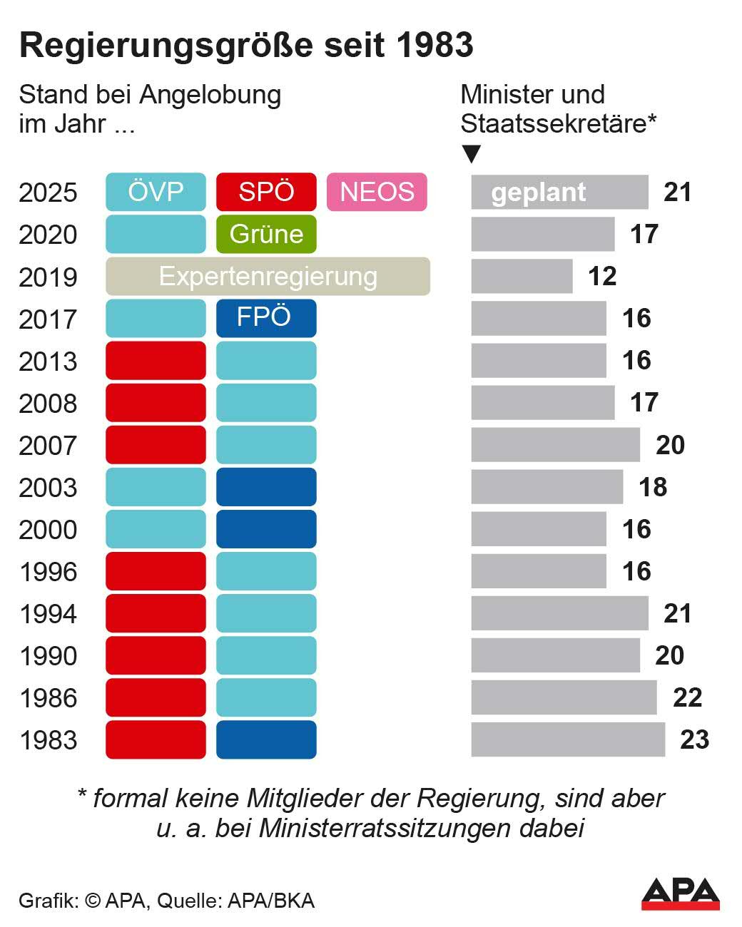 Geklärt ist die Frage der Ministerienverteilung zwischen den Parteien - mit je sechs Ressorts für ÖVP und SPÖ und zwei für die NEOS. Mit sieben ungewöhnlich hoch dürfte die Zahl der Staatssekretäre und -sekretärinnen werden. Die Besetzung der Regierungsposten innerhalb der Parteien ist hingegen teilweise noch offen. Die meisten Diskussionen scheint es dabei bei der SPÖ zu geben, vor allem bei der Frage der Besetzung des Finanzressorts gibt es noch Gesprächsbedarf.