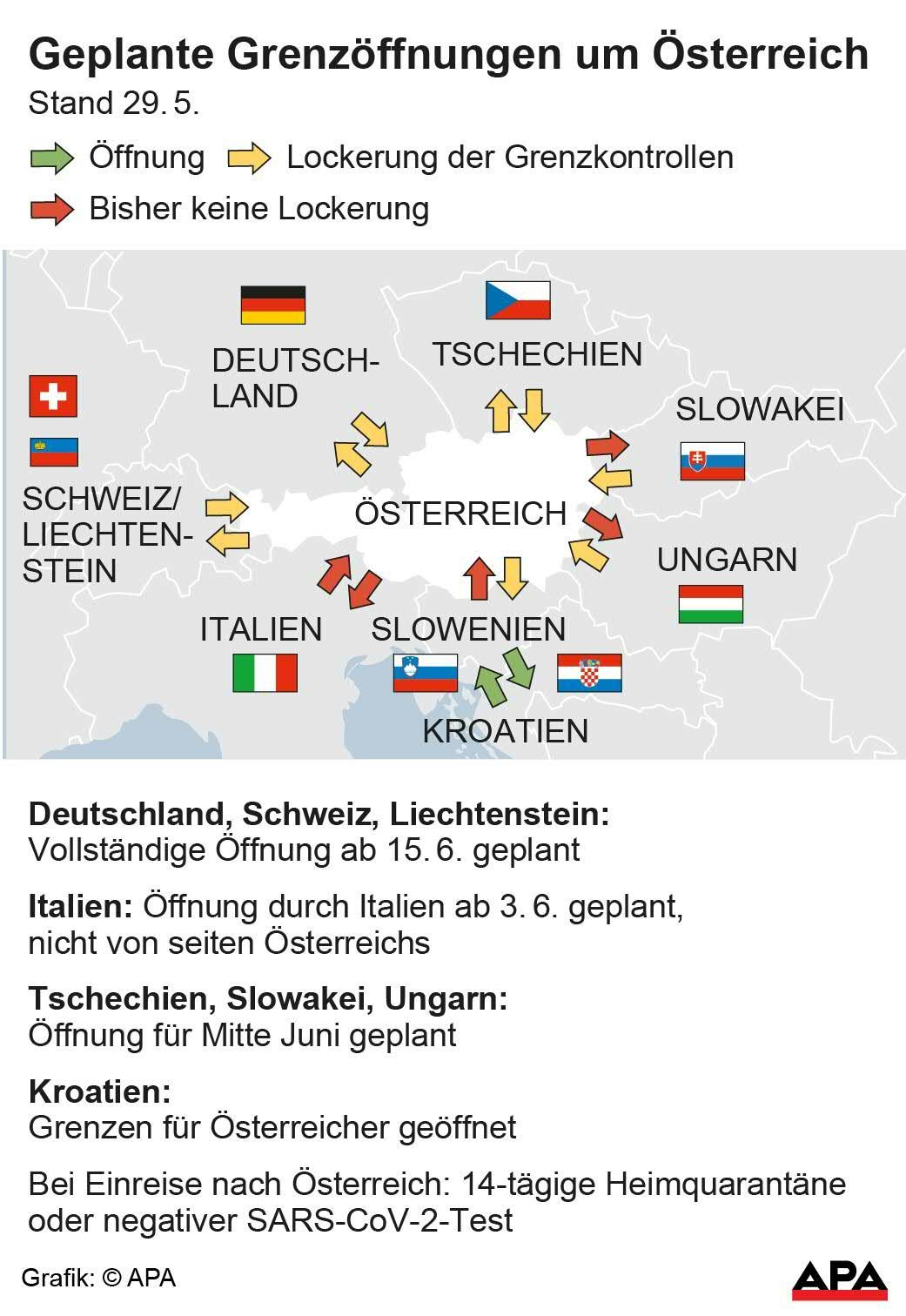Mit Deutschland, der Schweiz und Liechtenstein hat Österreich bereits eine vollständige Grenzöffnung ab dem 15. Juni vereinbart. Die Einreisebeschränkungen zu Tschechien, der Slowakei und Ungarn dürften ebenfalls Mitte Juni fallen. Die vier Länder waren bereits vergangene Woche darin im Prinzip übereingekommen, eine genaues Datum fehlt aber noch. Vor allem die Slowakei hat bisher bei der Grenzöffnung gebremst.