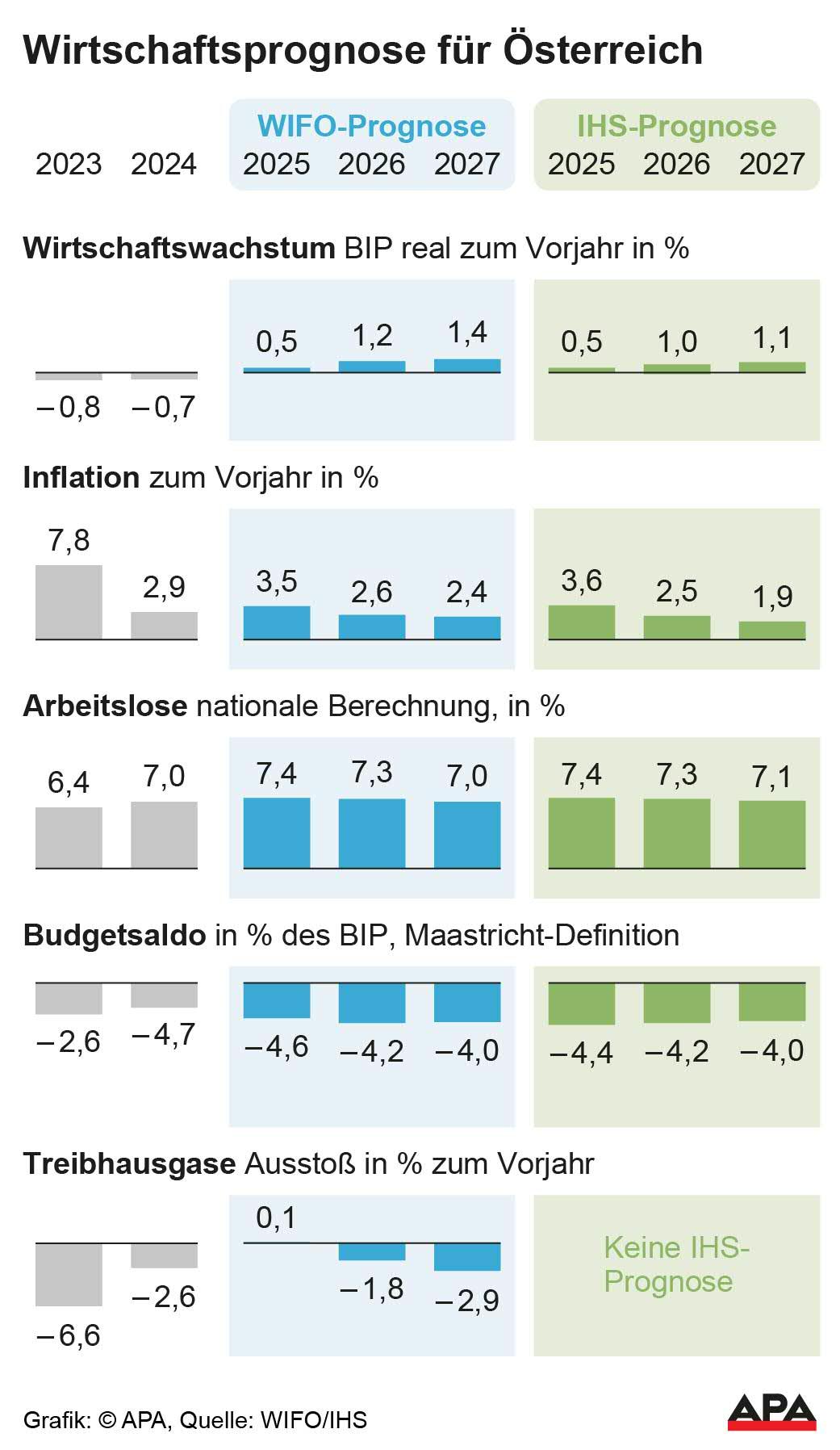 Gute Nachrichten gibt es bei der Teuerung: Die Inflation soll von heuer 3,5 Prozent (Wifo) bzw. 3,6 Prozent (IHS) auf 2,6 bzw. 2,5 Prozent im kommenden Jahr sinken. Zu Jahresbeginn 2026 fällt der Basiseffekt des Energiepreisanstieges vom Jänner 2025 weg, wodurch die Inflationsrate laut Wifo und IHS um bis zu 1 Prozentpunkt sinkt. Österreichs Inflationsrate wird 2026 und 2027 aber weiter deutlich über dem Eurozonen-Schnitt liegen. Die heimische Regierung müsse "die Dämpfung der Teuerung weiter priorisieren", betonte der Wifo-Direktor. Um die Inflation zu bekämpfen, brauche es mehr Wettbewerb und einen Fokus auf die Angebotspolitik sowie Zurückhaltung der öffentlichen Hand bei Gebührenerhöhungen.