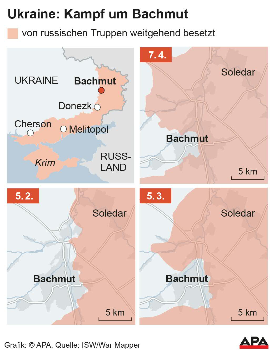 Die russischen Truppen haben in der schwer umkämpften Stadt Bachmut offenbar das Westufer des Flusses Bachmutka unter ihre Kontrolle gebracht.