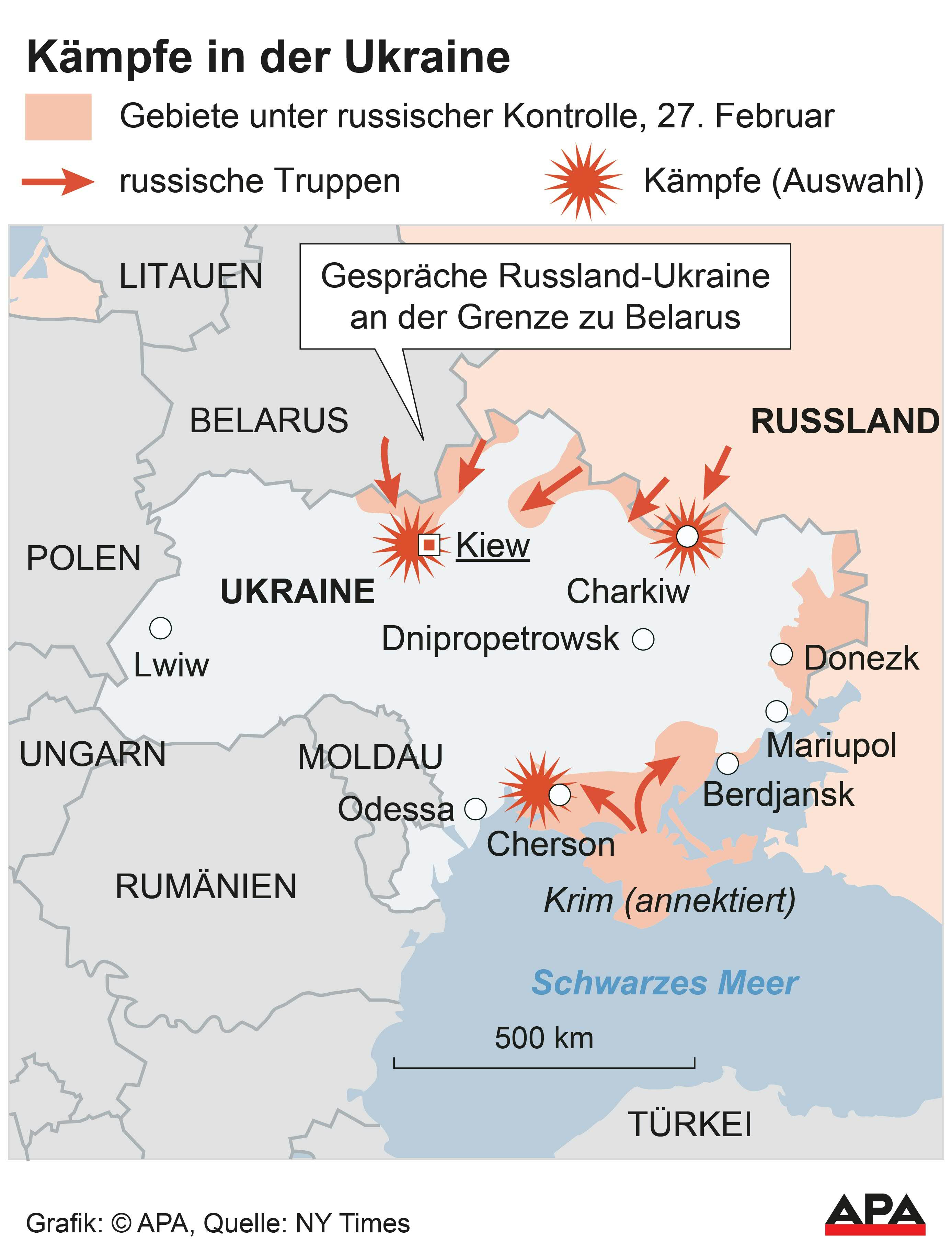 Am Montag hatten russische Streitkräfte die Hafenstadt Berdjansk eingenommen, die etwa in der Mitte des ukrainischen Küstenstreifens liegt. Die Nachrichtenagentur RIA meldete ergänzend, die pro-russischen Separatisten in der Provinz Donezk in der Ost-Ukraine hätten die Reihen zu den russischen Streitkräften in dem Gebiet geschlossen.
