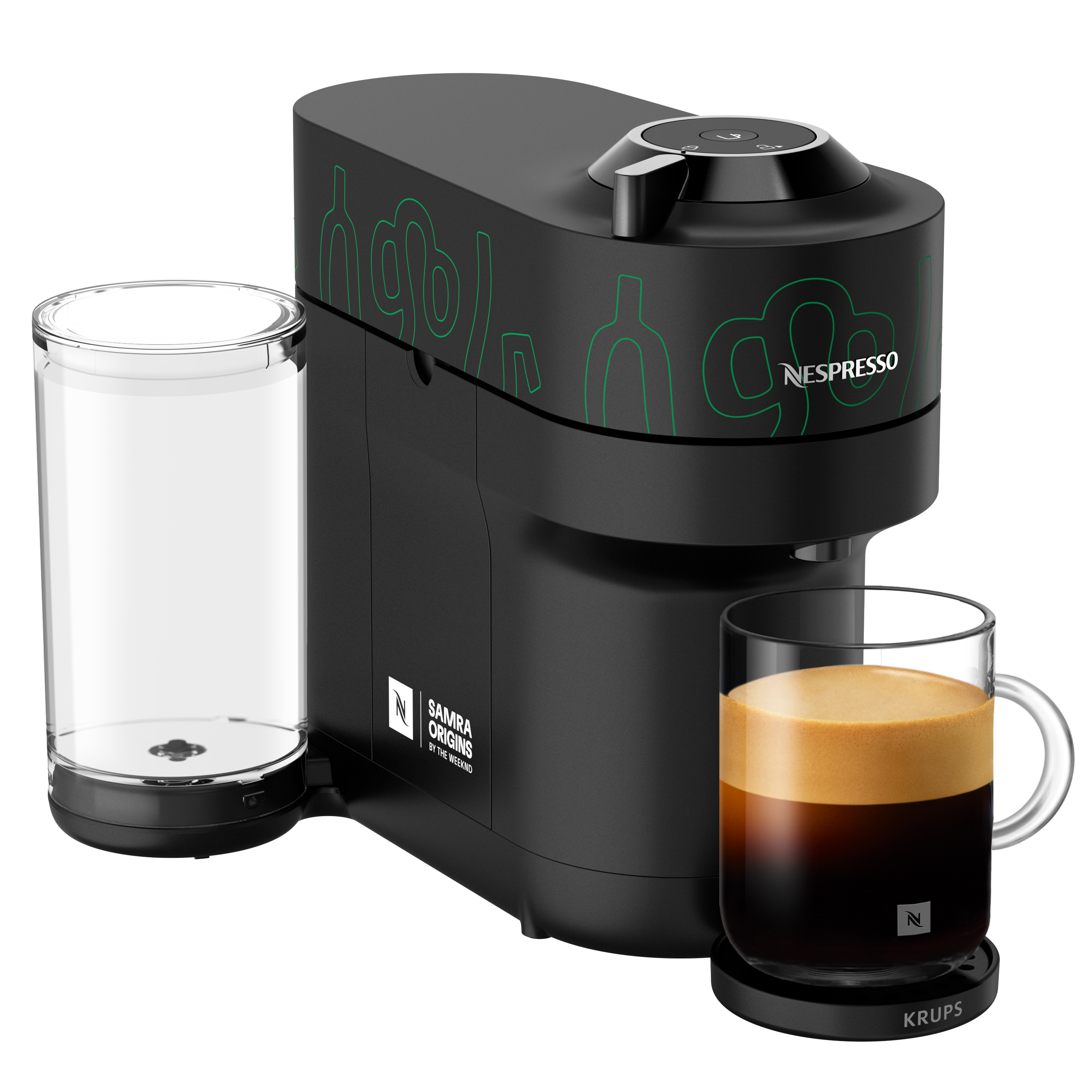 Eine stilvolle Maschine und Accessoires machen die Kollektion komplett: So gibt es auch eine VERTUO Pop +, ein TRAVEL Mug und ein TRAVEL Tumbler im limitierten SAMRA-Design, welches das Wort „Samra“ in der äthiopischen Amtssprache Amharisch darstellt. Das Design zeichnet sich durch einen charakteristischen Schwarzton aus und leuchtende, lebendige Farben sorgen für einen schönen Kontrast. So erstrahlt das SAMRA-Design auf den Schleifen des Kaffees in Buna Gelb und auf der VERTUO Pop + in Metad Grün, während es auf dem TRAVEL Tumbler und dem TRAVEL Mug in weiß gehalten wird.
