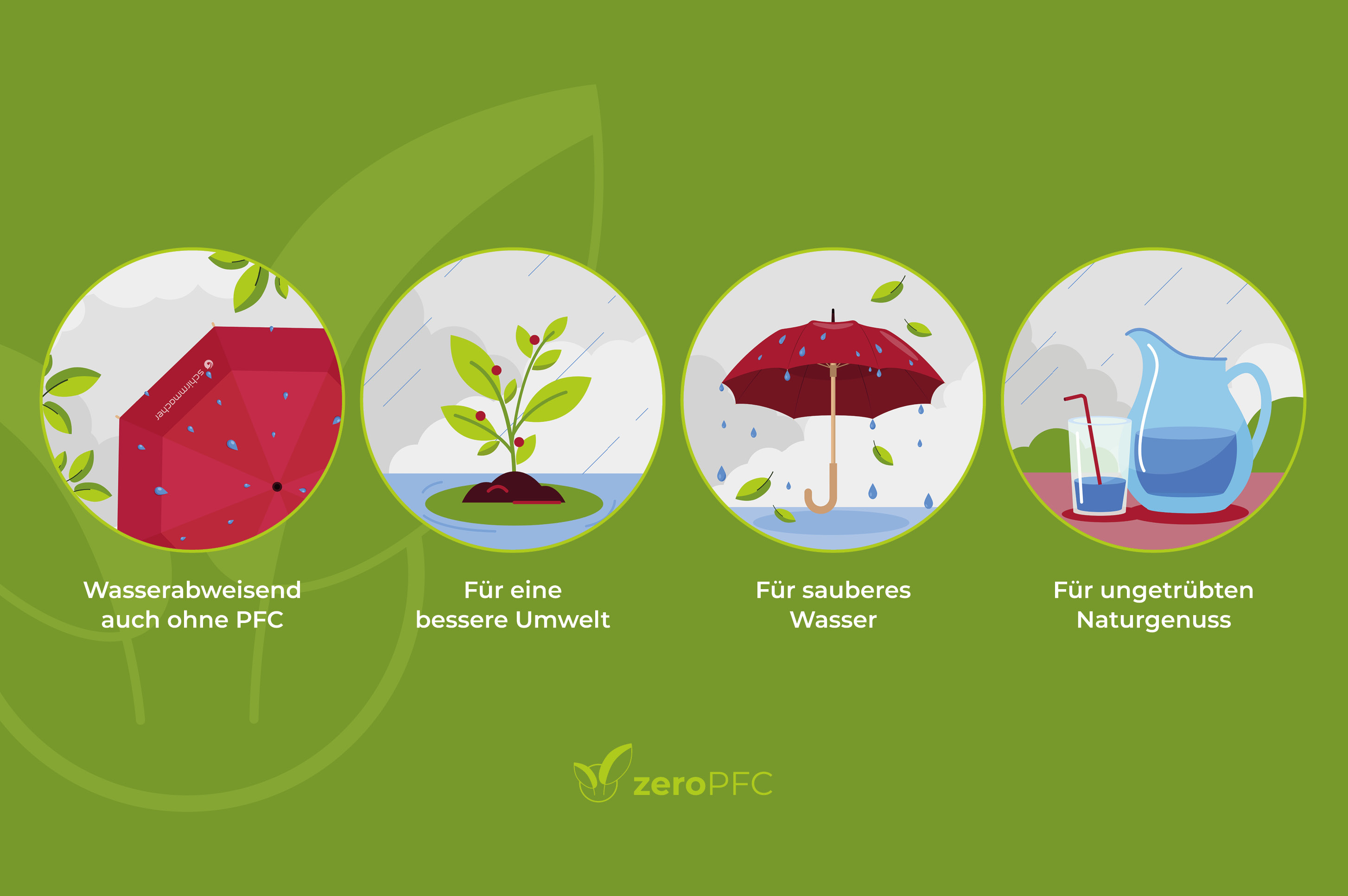 Während in der Imprägnierung herkömmlicher Regenschirme geringe Mengen sogenannter PFCs (per- und polyfluorierte Chemikalien) enthalten sind, verzichtet Schirmmacher bei den mit zeroPFC gekennzeichneten Schirmen auf diese umstrittenen Stoffe und übertrifft damit die bereits strengen EU-Vorgaben. Schritt für Schritt wird ein Großteil des Sortiments umgestellt, um einen sinnvollen Beitrag für unsere Umwelt zu leisten.