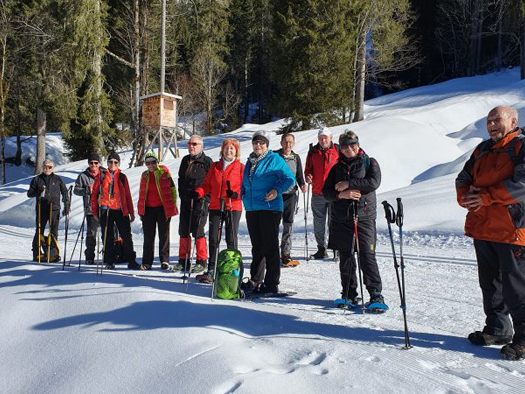 Diesmal wurde das Ziel Schönebach, Gasthaus Egender ausgewählt. Mit Fahrgemeinschaften ging es vom Kirchplatz Höchst Richtung Sibratsgfäll zum Schilift Krähenberg. Die Sonne strahlte mit den Teilnehmern um die Wette. Dort angekommen, wurden sofort die Schneeschuhe oder Schuh-Schneeketten angelegt und der Loipe entlang Richtung Schönebach.