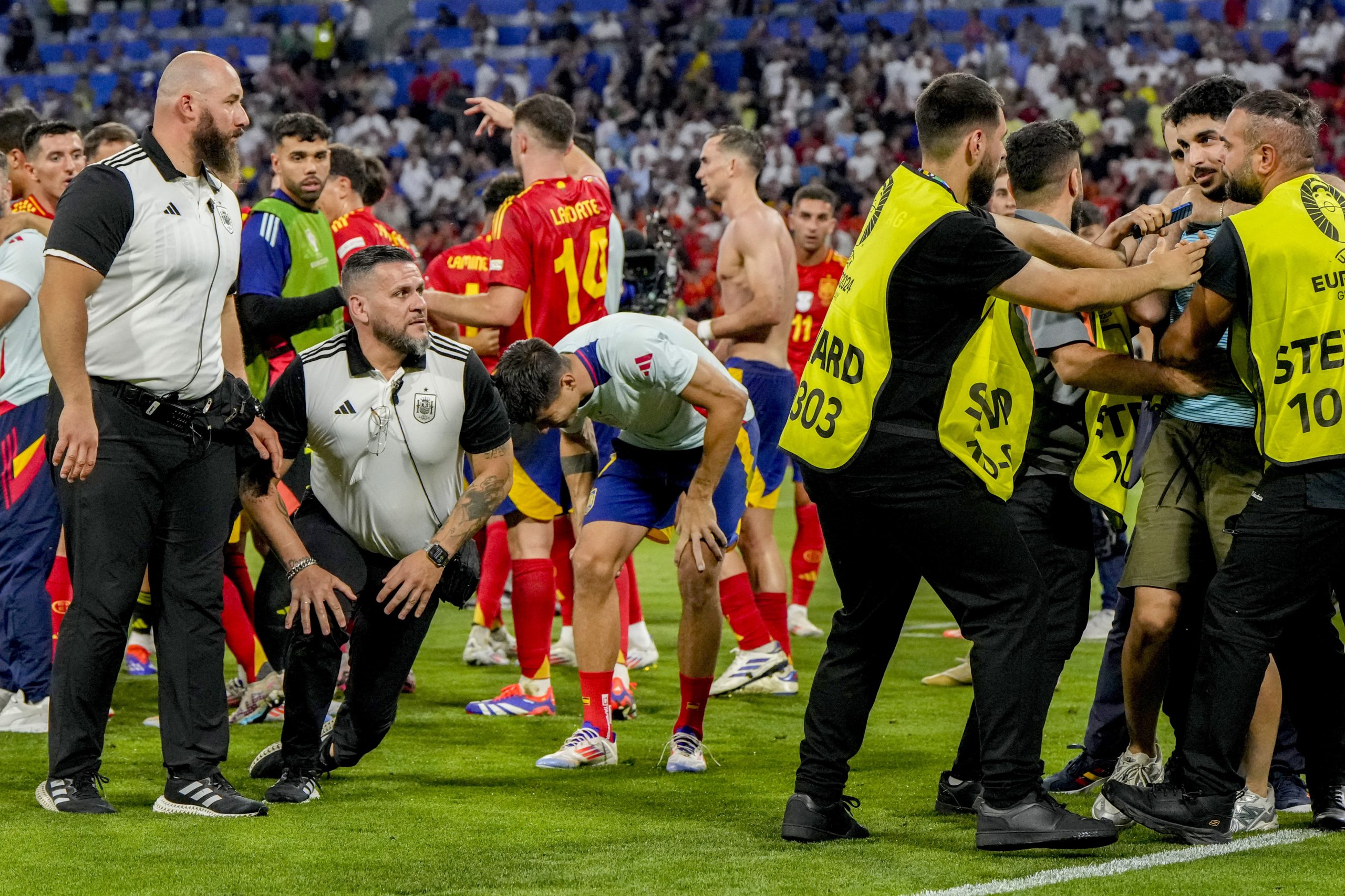 Während die „Furia Roja“ am Dienstagabend ihren triumphalen Sieg im EM-Halbfinale gegen Frankreich (2:1) in der Allianz Arena feierte, sorgte ein unerwarteter Zwischenfall für Besorgnis: Ein Flitzer stürmte auf den Platz, um ein Selfie mit dem französischen Superstar Kylian Mbappé zu ergattern. Die Sicherheitskräfte eilten herbei, um den Eindringling zu stoppen, doch dabei rutschte ein Mitarbeiter aus und krachte in die Beine des spanischen Kapitäns Álvaro Morata.