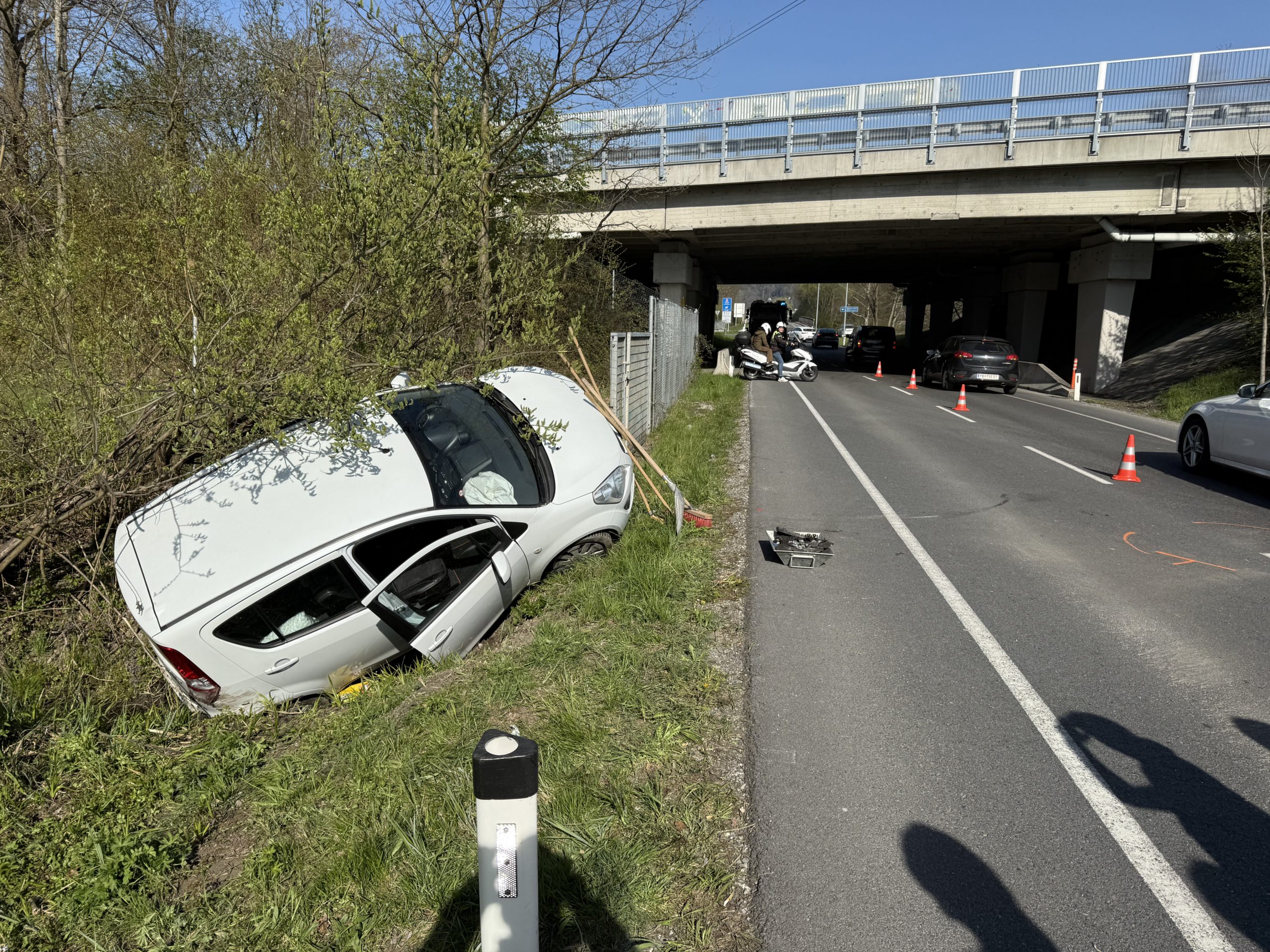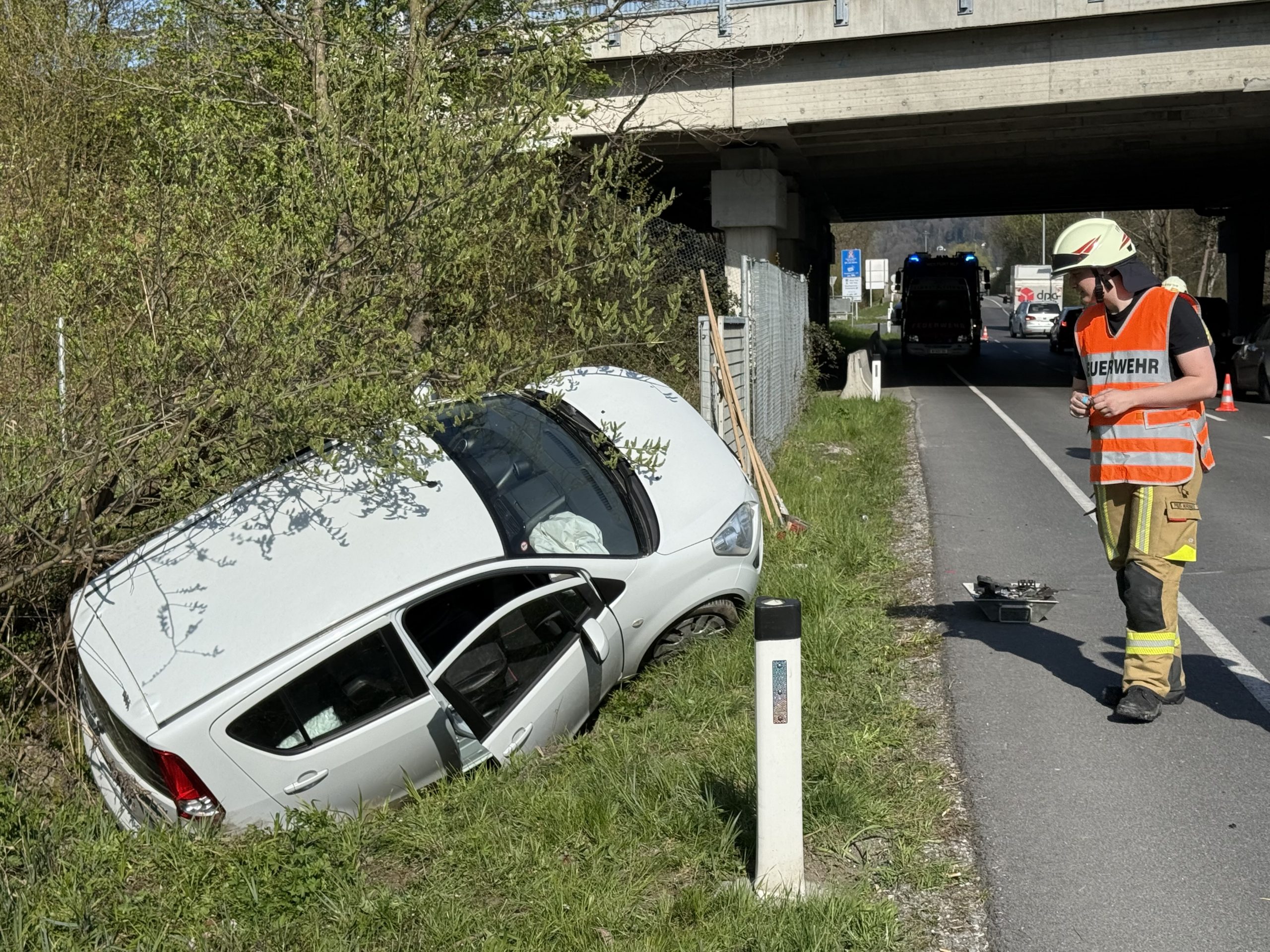 Schweizer Pkw nach Crash auf der Senderstraße in Graben geschleudert
