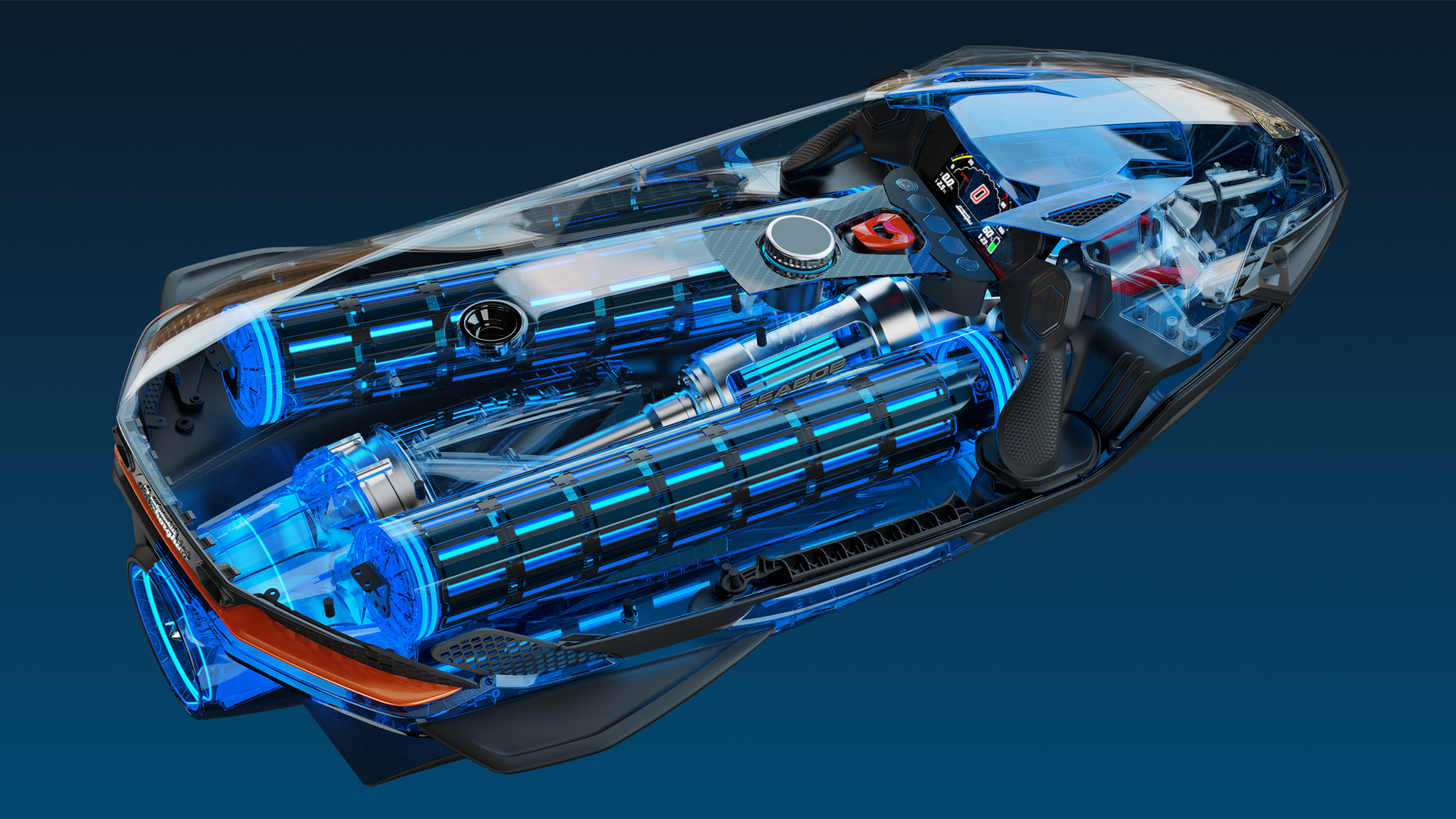 Die Handschrift von Lamborghini ist unübersehbar. Im Cockpit findet sich nicht nur der charakteristische Startknopf der Supersportwagen, sondern auch ein digitales Display mit originalgetreuer Tachografie. Zentral im Blickfeld: ein Carbon-Element, wie man es aus den Cockpits der Boliden kennt. Auch technisch überzeugt das Fahrzeug mit hochwertigen Komponenten: eine Motorwelle aus Carbon, Bauteile aus Titan und Magnesium sowie elektrisch ausfahrbare Flügel sorgen für optimale Stabilität und Kontrolle auf der Wasseroberfläche.