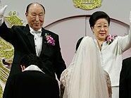 Zusammen mit seiner Frau Han Hak Ja habe Moon den Teilnehmern aus Südkorea und anderen Ländern den Segen erteilt. Han und Moon, der sich als Messias bezeichnet, werden von den Anhängern als die “Wahren Eltern” verehrt.